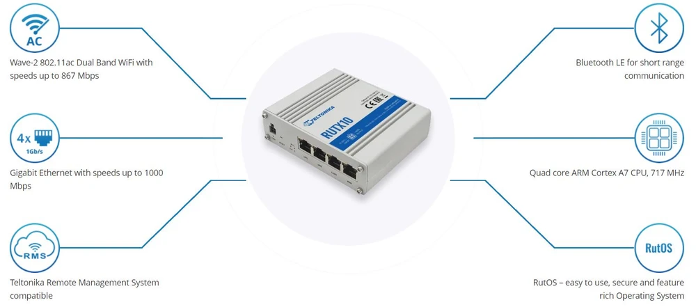 Wysoce konfigurowalny system operacyjny RutOS jest sercem RUTX10, a idealna harmonia pomiędzy oferowanymi cechami sprzętowymi i oprogramowaniem sprawia, że urządzenie to doskonale sprawdza się w rozwiązaniach dla przedsiębiorstw. Czterordzeniowy procesor ARM Cortex A7 717 MHz gwarantuje funkcjonalność VPN, a 256 MB pamięci Flash pozwala zainstalować dodatkowe protokoły.