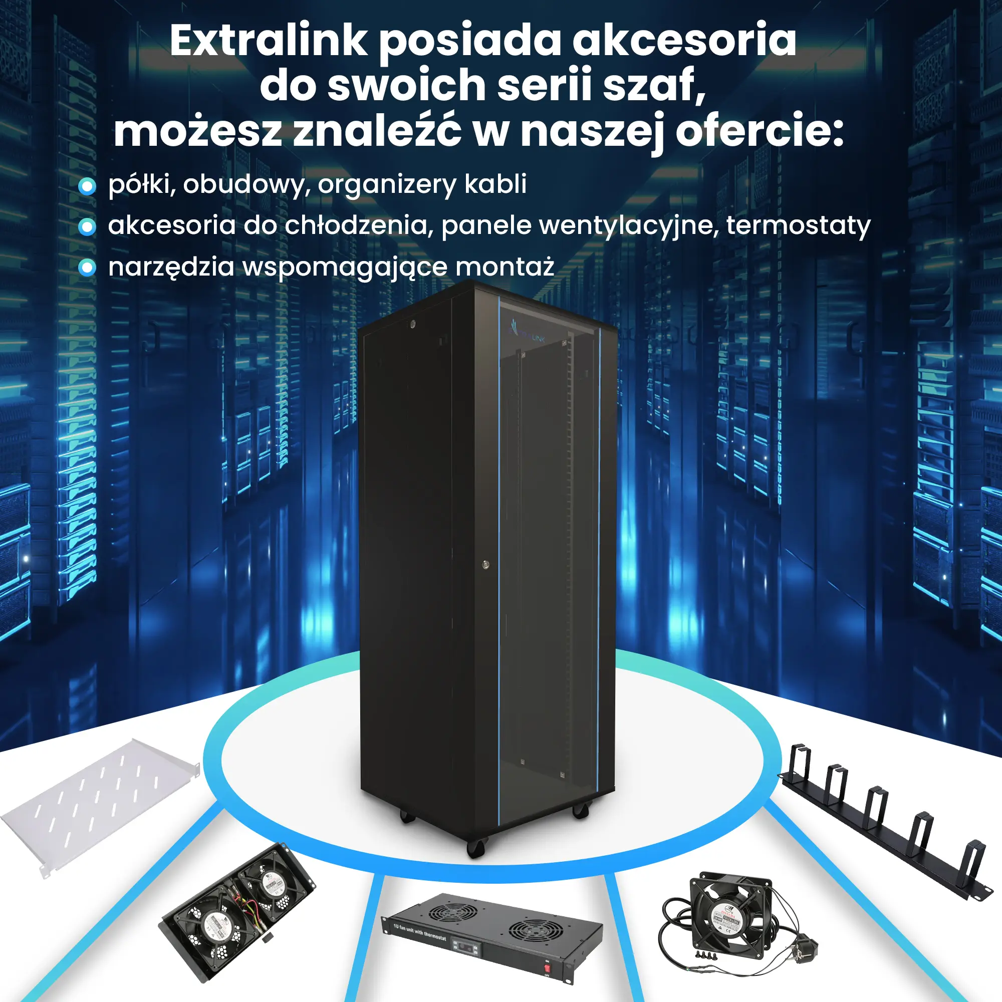 Szafa rackowa firmy Extralink jest dedykowana do zastosowania w biurach, serwerowniach sieciowych oraz pomieszczeniach sterowania instalacjami CCTV. Jej zewnętrzne ściany wykonane są z walcowanej na zimno blachy stalowej. Niezwykle praktyczne, wyposażone w szybę ze szkła hartowanego przednie drzwi pozwalają na otwieranie z lewej lub prawej strony.