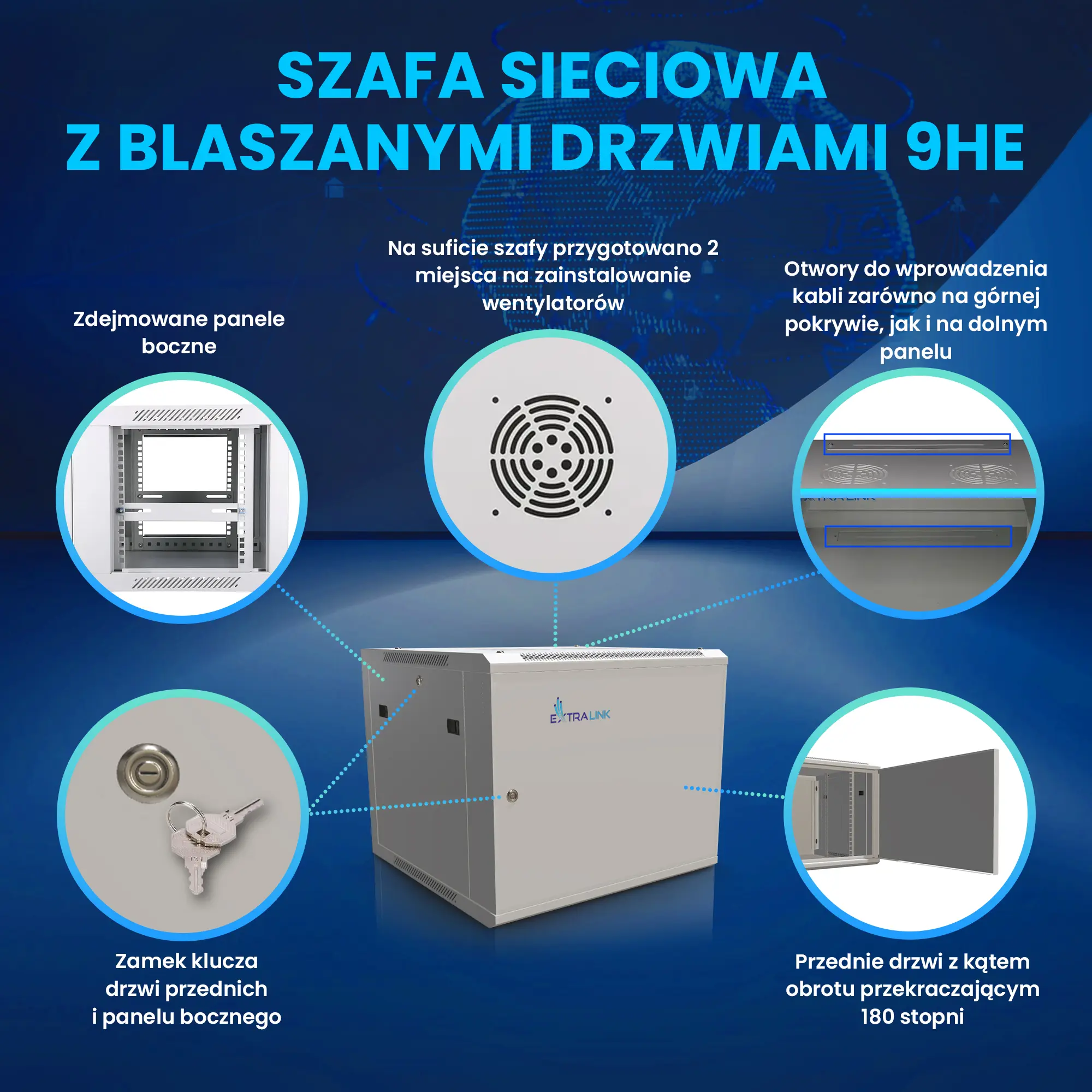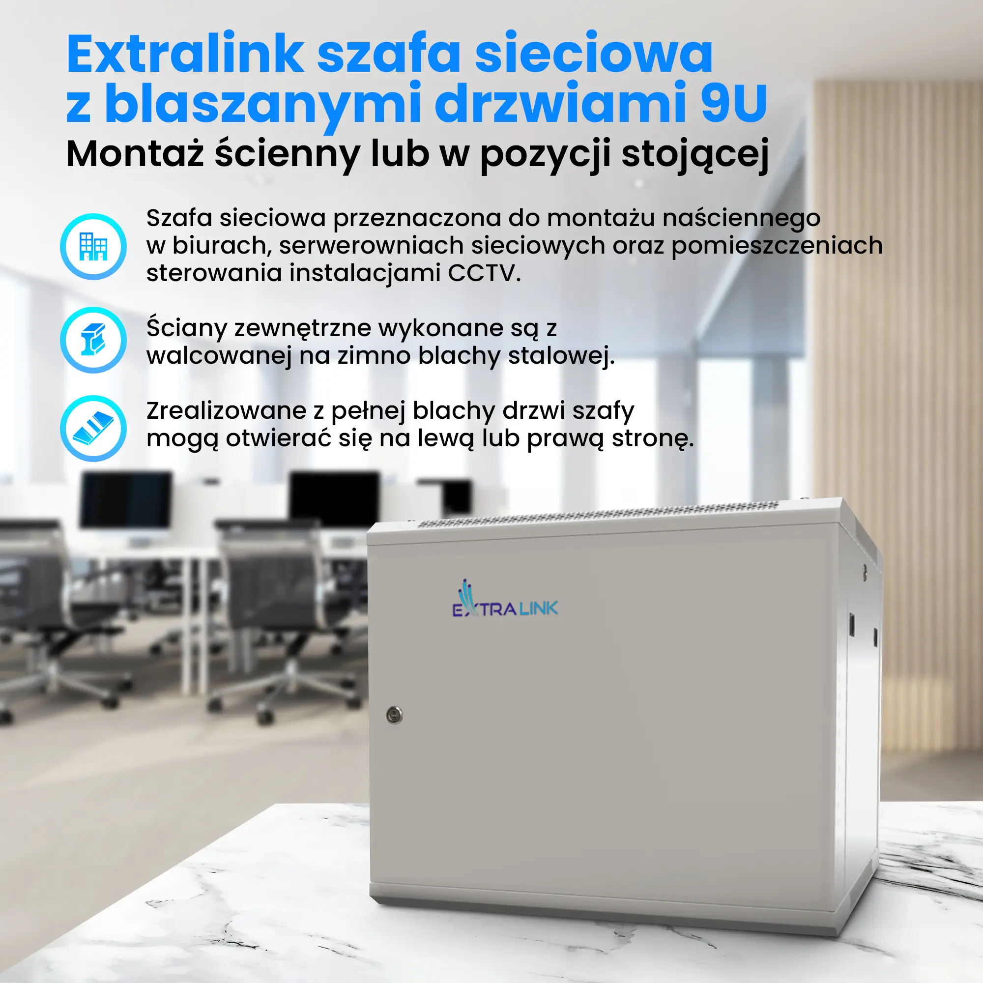 Szafa rackowa firmy Extralink jest przeznaczona do montażu naściennego w biurach, serwerowniach sieciowych oraz pomieszczeniach sterowania instalacjami CCTV. Ściany zewnętrzne wykonane są z walcowanej na zimno blachy stalowej. Zrealizowane z pełnej blachy drzwi szafy mogą otwierać się na lewą lub prawą stronę.
