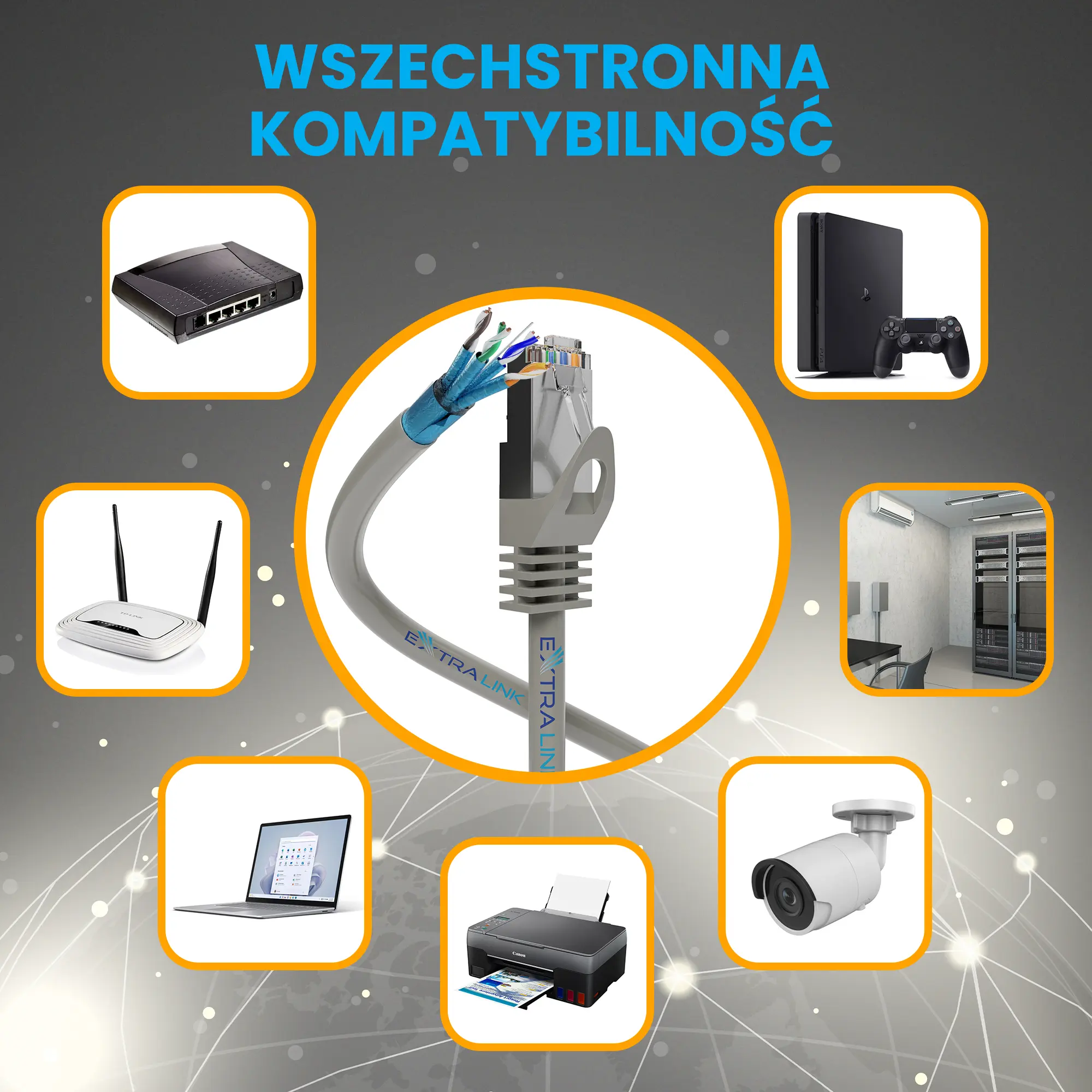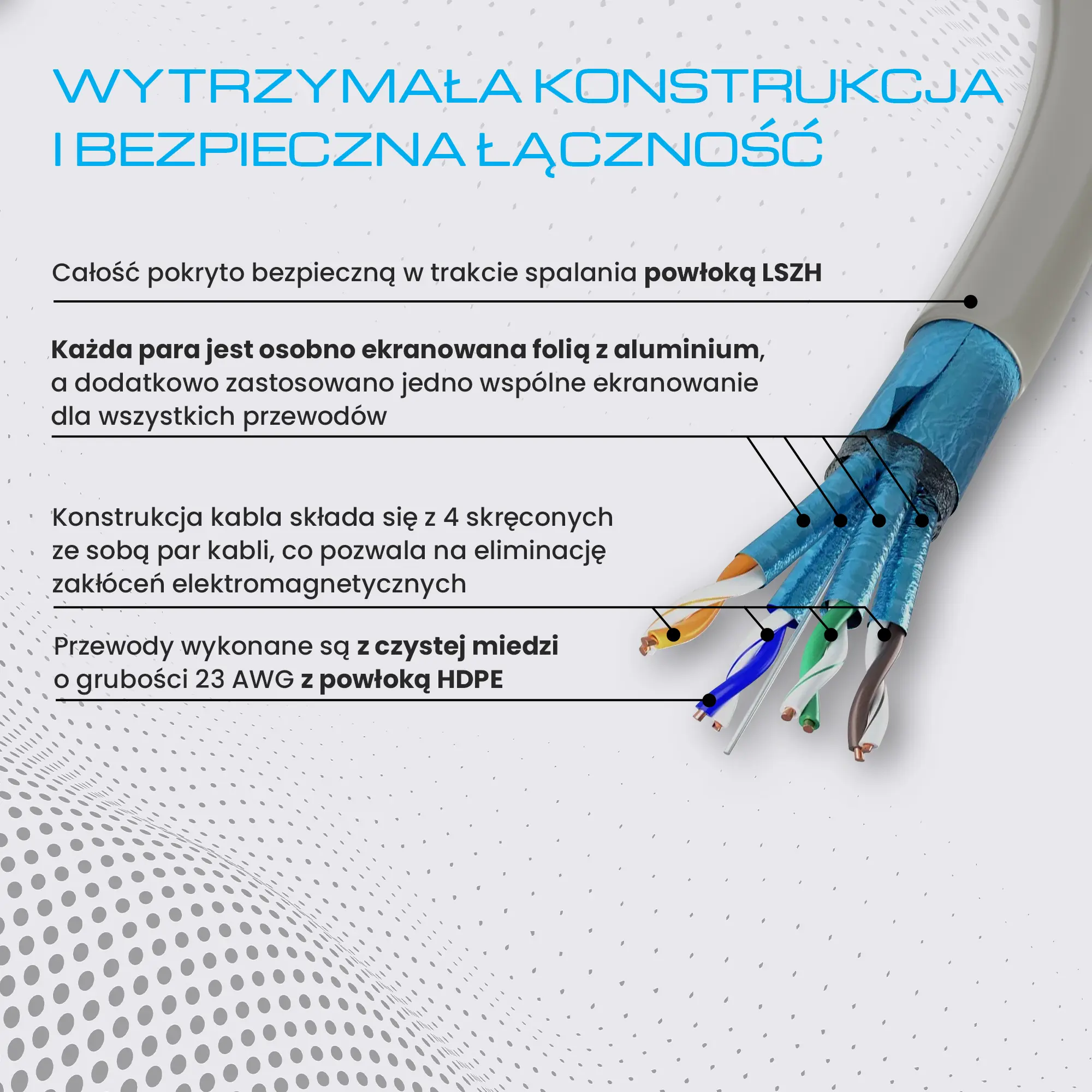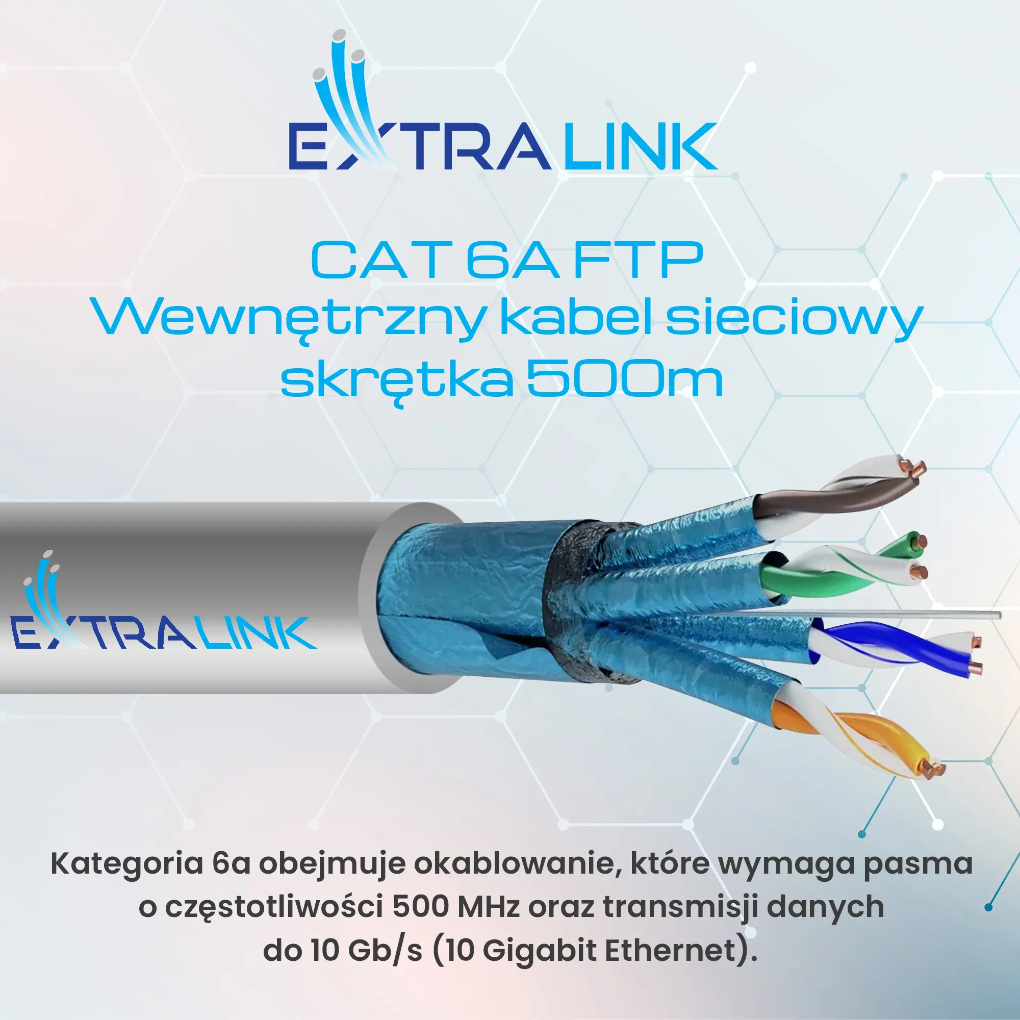 Extralink Cat. 6A FTP to wysokiej jakości kabel sieciowy przeznaczony do instalacji wewnątrz pomieszczeń. Kategoria 6a obejmuje okablowanie, które wymaga pasma o częstotliwości 500 MHz oraz transmisji danych do 10 Gb/s (10 Gigabit Ethernet). Konstrukcja kabla składa się z 4 skręconych ze sobą par kabli, co pozwala na eliminację zakłóceń elektromagnetycznych. Przewody wykonane są z czystej miedzi o grubości 23 AWG z powłoką HDPE. Każda para jest osobno ekranowana folią z aluminium, a dodatkowo zastosowano jedno wspólne ekranowanie dla wszystkich przewodów. Całość pokryto bezpieczną w trakcie spalania powłoką LSZH (ang. Low Smoke Zero Halogen), zgodnie z wymogami przepisów przeciwpożarowych dotyczących dużych budynków użytkowych. Opakowanie zawiera 500 m kabla.