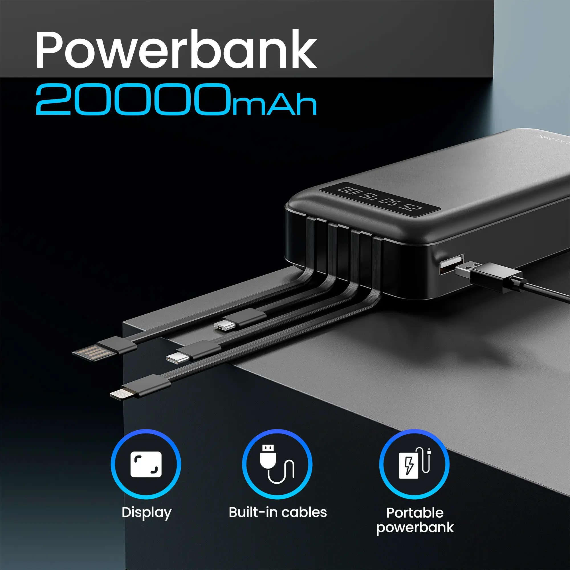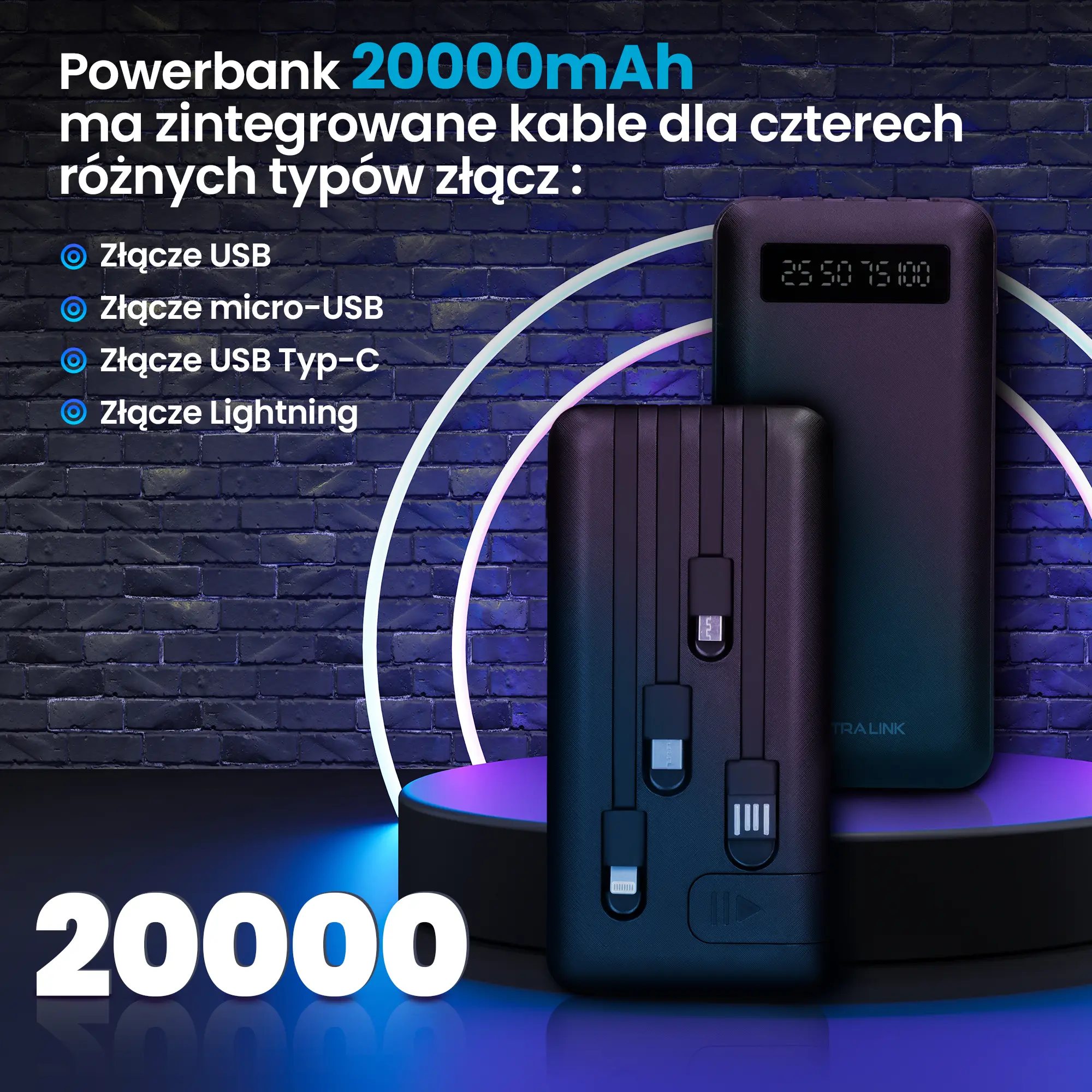 Power bank Extralink EPB-084 to kompaktowy power bank w przystępnej cenie. Pojemność 20000 mAh wystarcza do wielokrotnego naładowania jednego urządzenia. Powerbank posiada zintegrowane kable w czterech standardach, dzięki czemu możesz ładować urządzenia o różnych złączach.