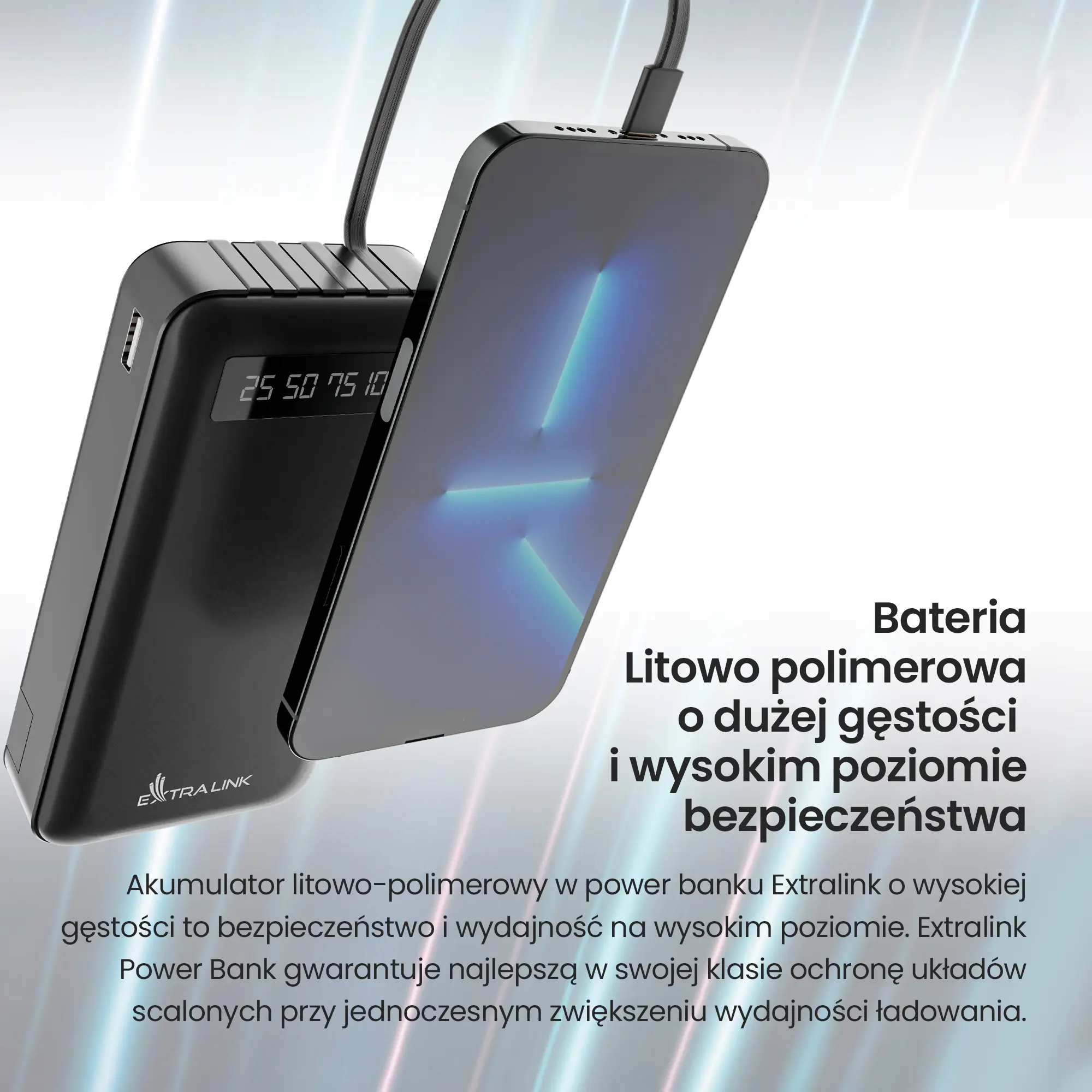 Akumulator litowo-polimerowy w power banku Extralink o wysokiej gęstości to bezpieczeństwo i wydajność na wysokim poziomie. Extralink Power Bank gwarantuje najlepszą w swojej klasie ochronę układów scalonych przy jednoczesnym zwiększeniu wydajności ładowania.