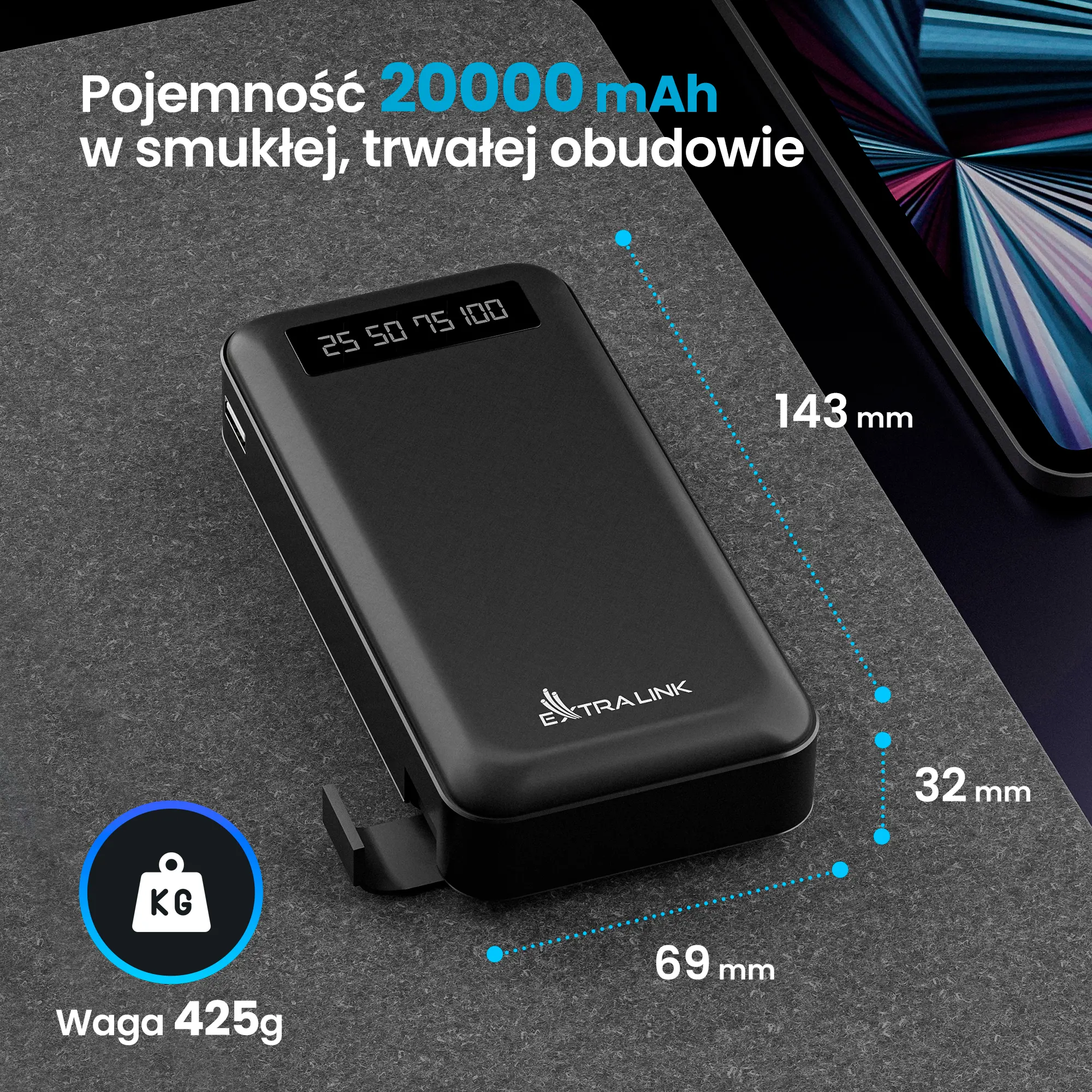 Power bank Extralink EPB-084 cechuje się pojemnością 20000 mAh, co oznacza, że można nim wielokrotnie naładować smartfon lub tablet.