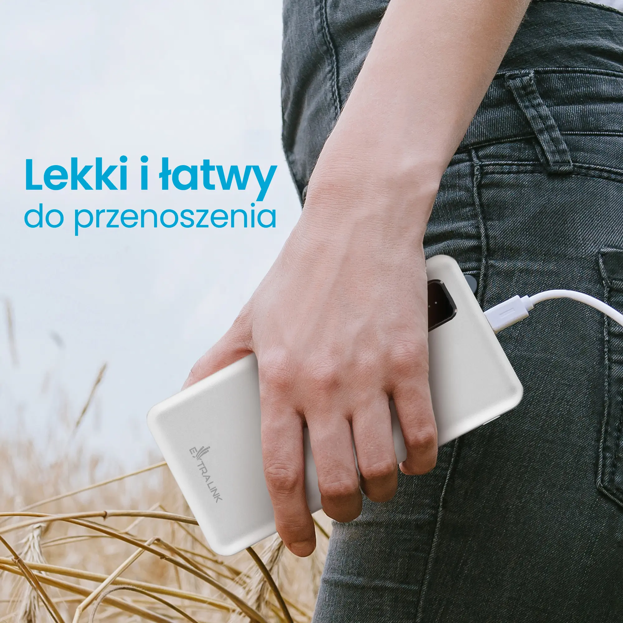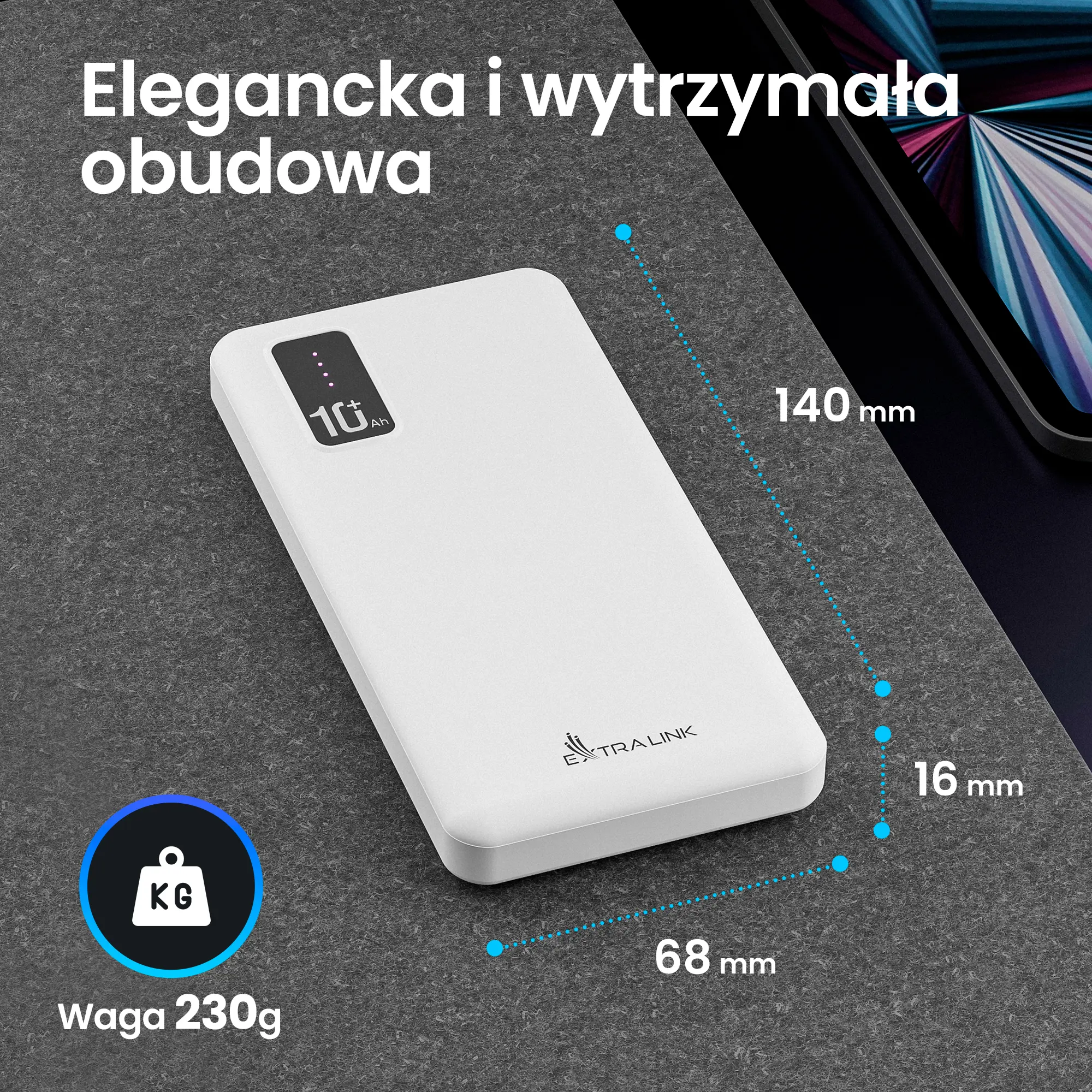 Power bank Extralink EPB-098W to urządzenie wyposażone w pojemność 10000 mAh, co pozwala na wielokrotne naładowanie smartfona czy tabletu, zapewniając niezawodne źródło energii w kompaktowej i stylowej obudowie.