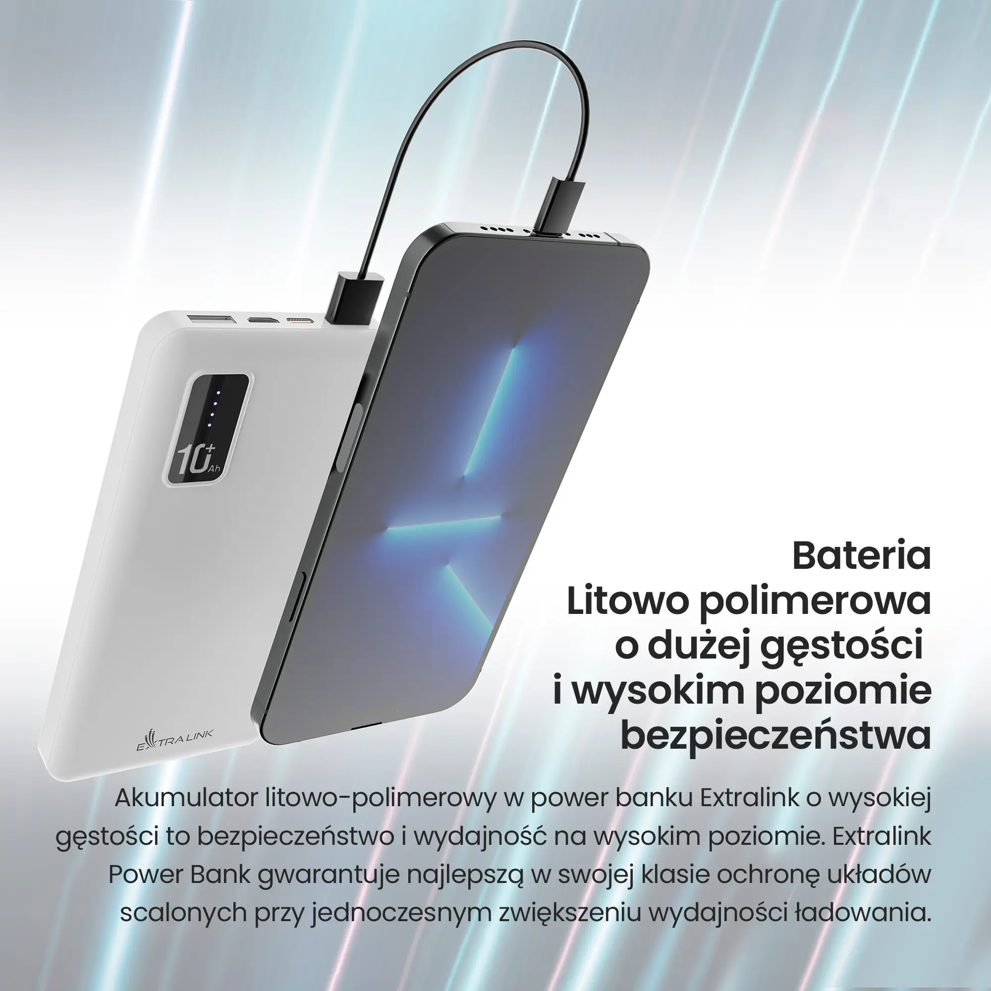 Akumulator litowo-polimerowy w power banku Extralink o wysokiej gęstości to bezpieczeństwo i wydajność na wysokim poziomie. Extralink Power Bank gwarantuje najlepszą w swojej klasie ochronę układów scalonych przy jednoczesnym zwiększeniu wydajności ładowania.
