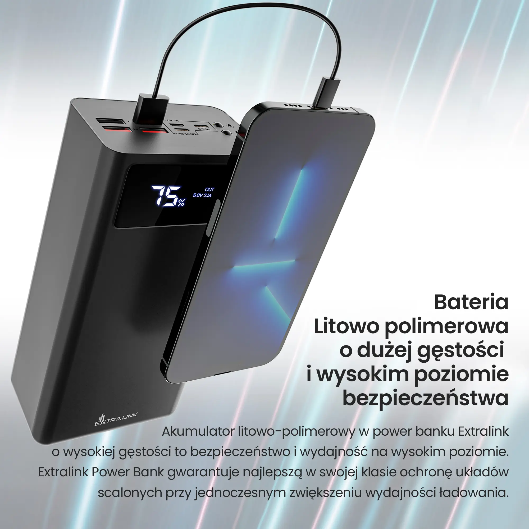 Akumulator litowo-polimerowy w power banku Extralink o wysokiej gęstości to bezpieczeństwo i wydajność na wysokim poziomie. Extralink Power Bank gwarantuje najlepszą w swojej klasie ochronę układów scalonych przy jednoczesnym zwiększeniu wydajności ładowania.