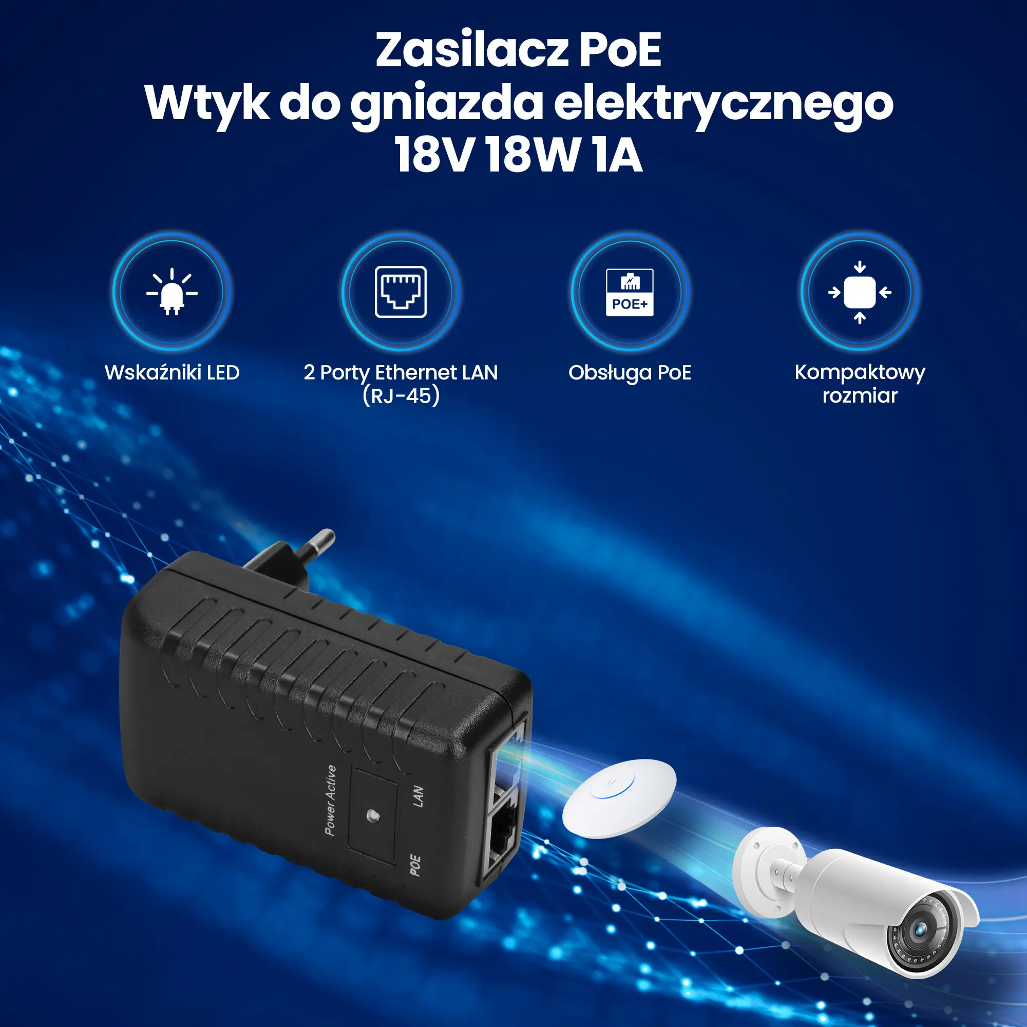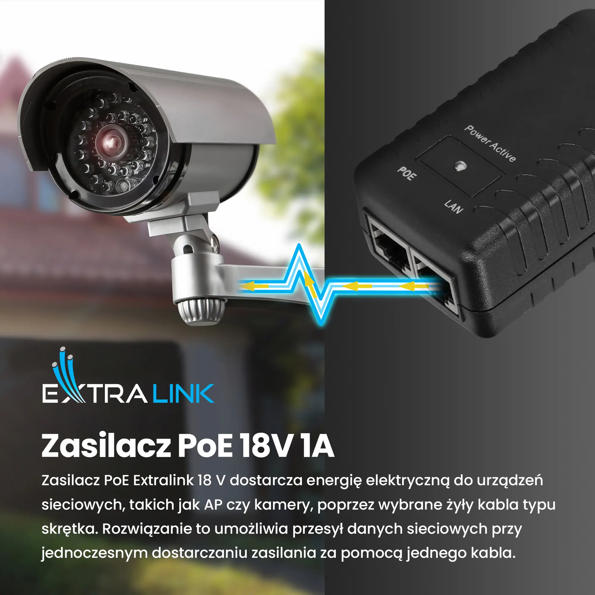 Zasilacz PoE Extralink 18 V dostarcza energię elektryczną do urządzeń sieciowych, takich jak Access Pointy czy kamery, poprzez wybrane żyły kabla typu skrętka. Dzięki temu rozwiązaniu możliwe jest przesyłanie danych sieciowych oraz dostarczanie zasilania za pomocą jednego kabla.