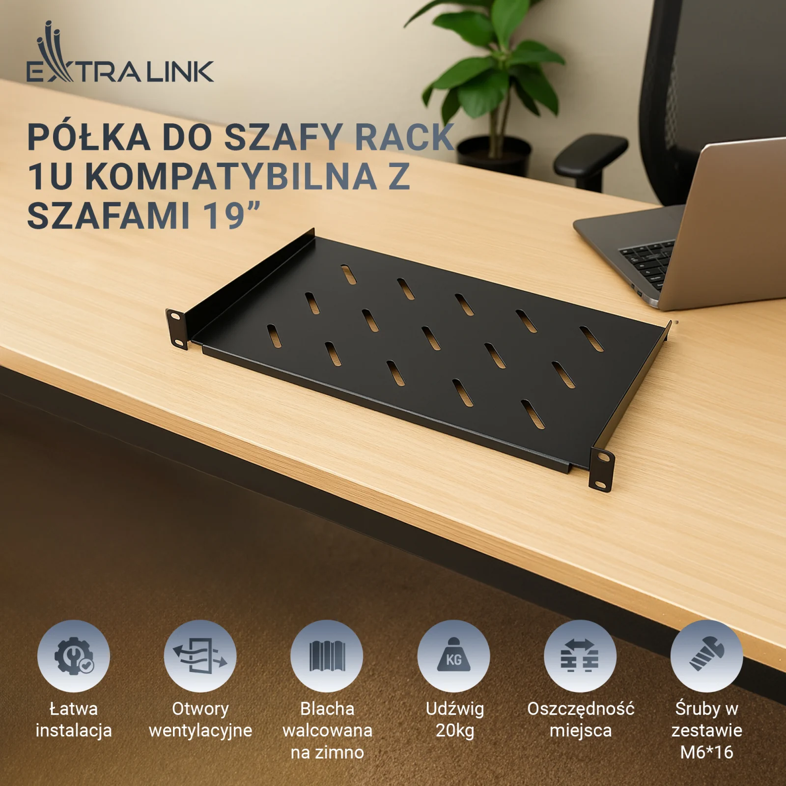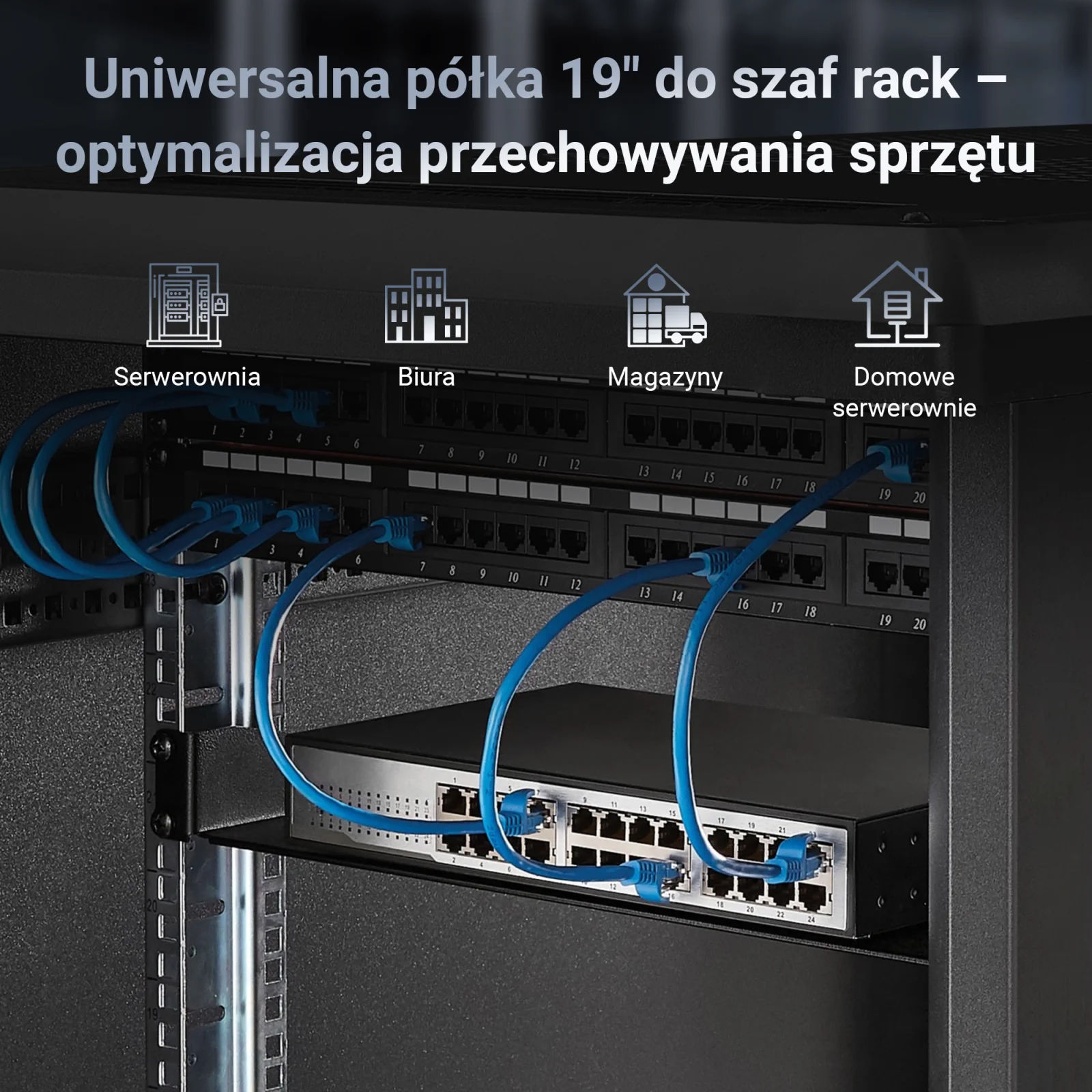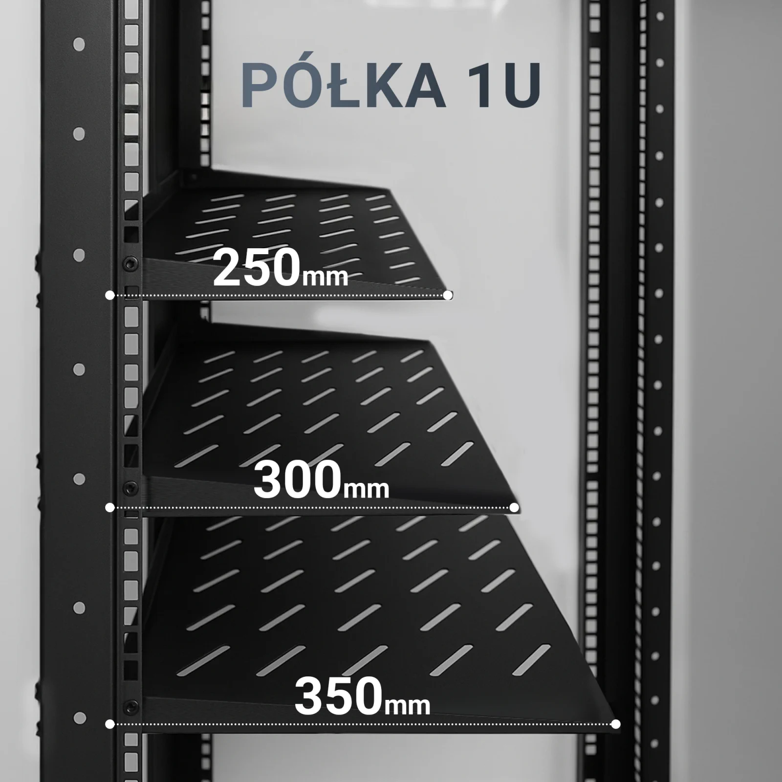 Półka stała o rozmiarze 19" i szerokości 350mm dedykowana do wiszących szaf RACK. Wykonana z blachy stalowej w kolorze czarnym. Półka jest mocowana 4-punktowo, co gwarantuje jej stabilność. Szafy standardu RACK znajdują szerokie zastosowanie w serwerowniach, studiach nagrań, pomieszczeniach przemysłowych, teletechnice i energetyce.