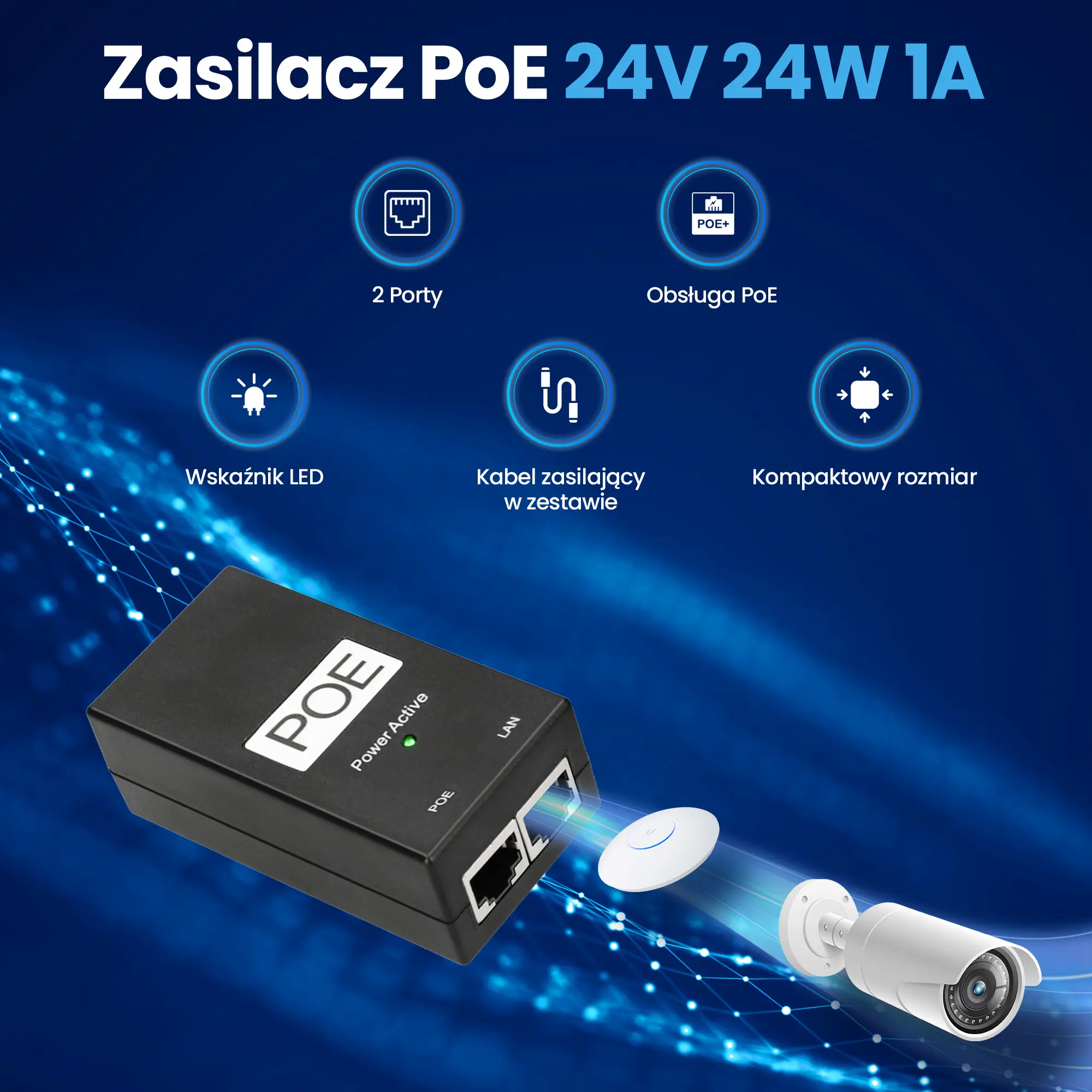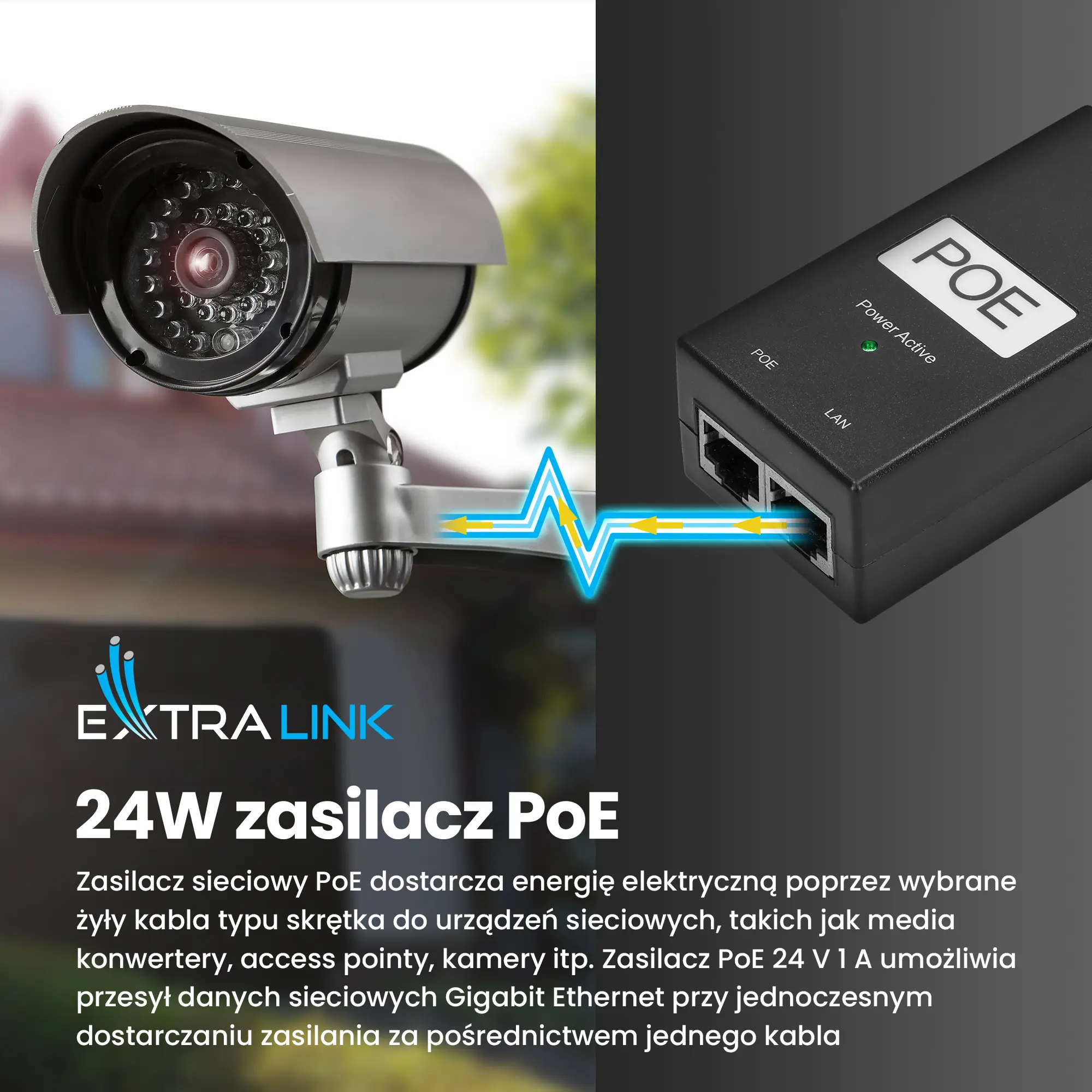 Zasilacz PoE Extralink o mocy 24W i napięciu 24V dostarcza energii przez kabel typu skrętka do urządzeń sieciowych, takich jak media konwertery, access pointy, kamery. Dzięki temu można przesyłać dane sieciowe Gigabit Ethernet i dostarczać zasilanie jednocześnie przez jeden kabel. Model ten obsługuje Passive PoE, co pozwala na transmisję z prędkością Gigabit Ethernet, aczkolwiek nie jest zgodny ze standardem IEEE 8023at/af. W przeciwieństwie do zasilaczy z jackiem 5.5/2.1 mm, ten adapter PoE zasila bezpośrednio urządzenia Gigabit PoE bez potrzeby dodatkowych akcesoriów sieciowych.