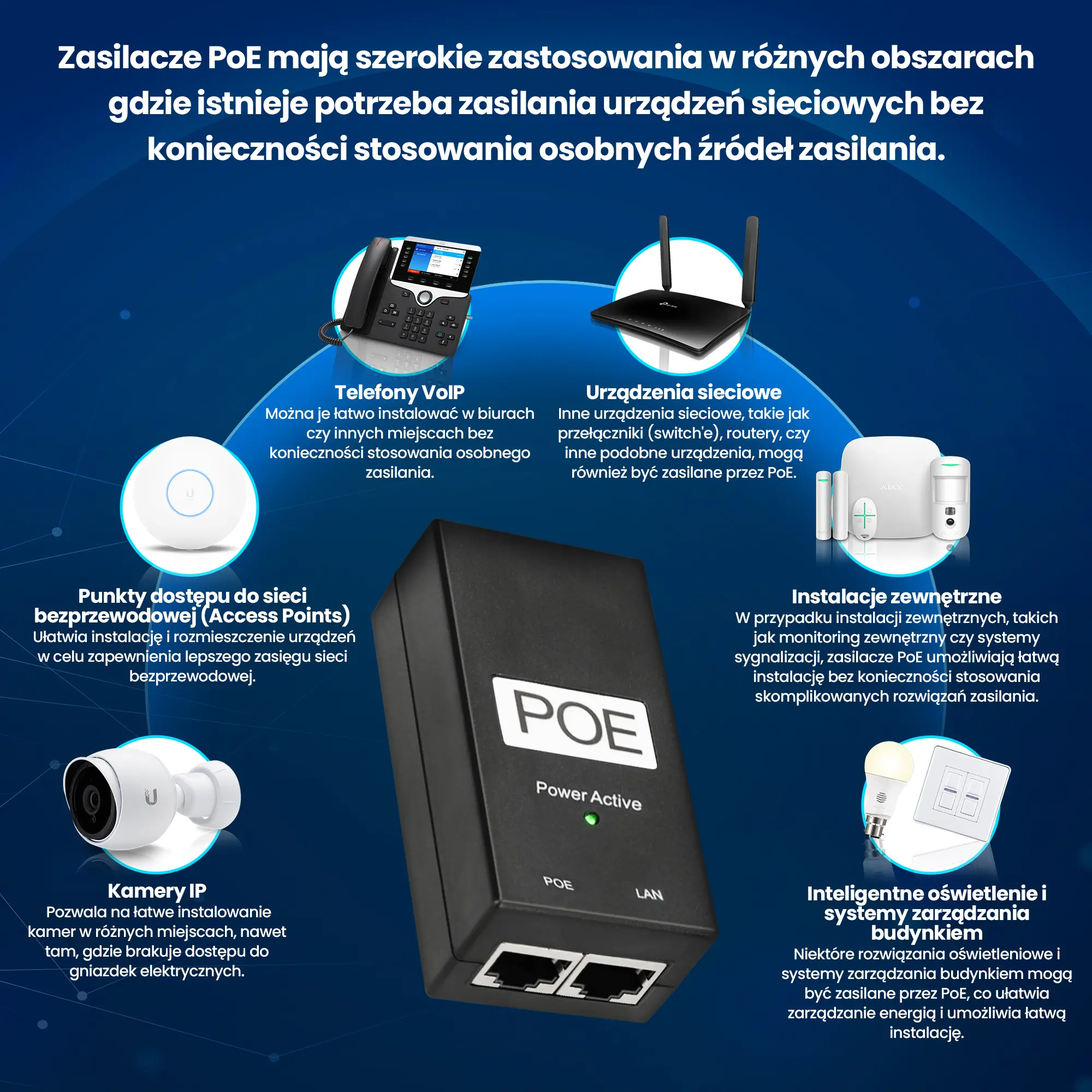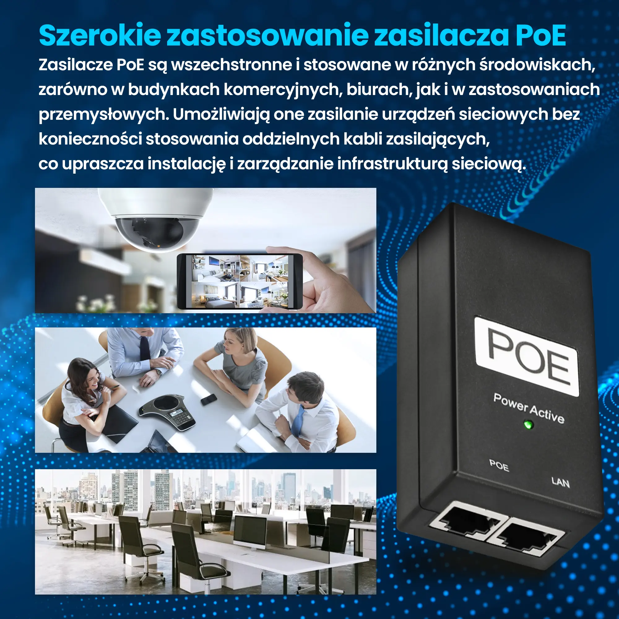 Zasilacz wyposażony jest w kabel zasilający o długości 1,2 metra zakończony złączem typu koniczyna oraz w dwa porty RJ45, do jednego podłącza się urządzenie, które ma być zasilane, a drugie gniazdo służy do podłączenia patchcordem switcha lub routera. Urządzenie można zainstalować w pomieszczeniach mieszkalnych, teletechniczne lub szafach typu rack.