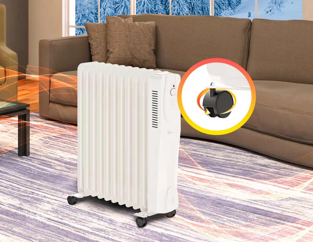 4 obrotowe kółka samonastawne i solidny uchwyt do przenoszenia ułatwiają transport grzejnika z pokoju do pokoju. Ciesz się ciepłem zawsze i wszędzie.