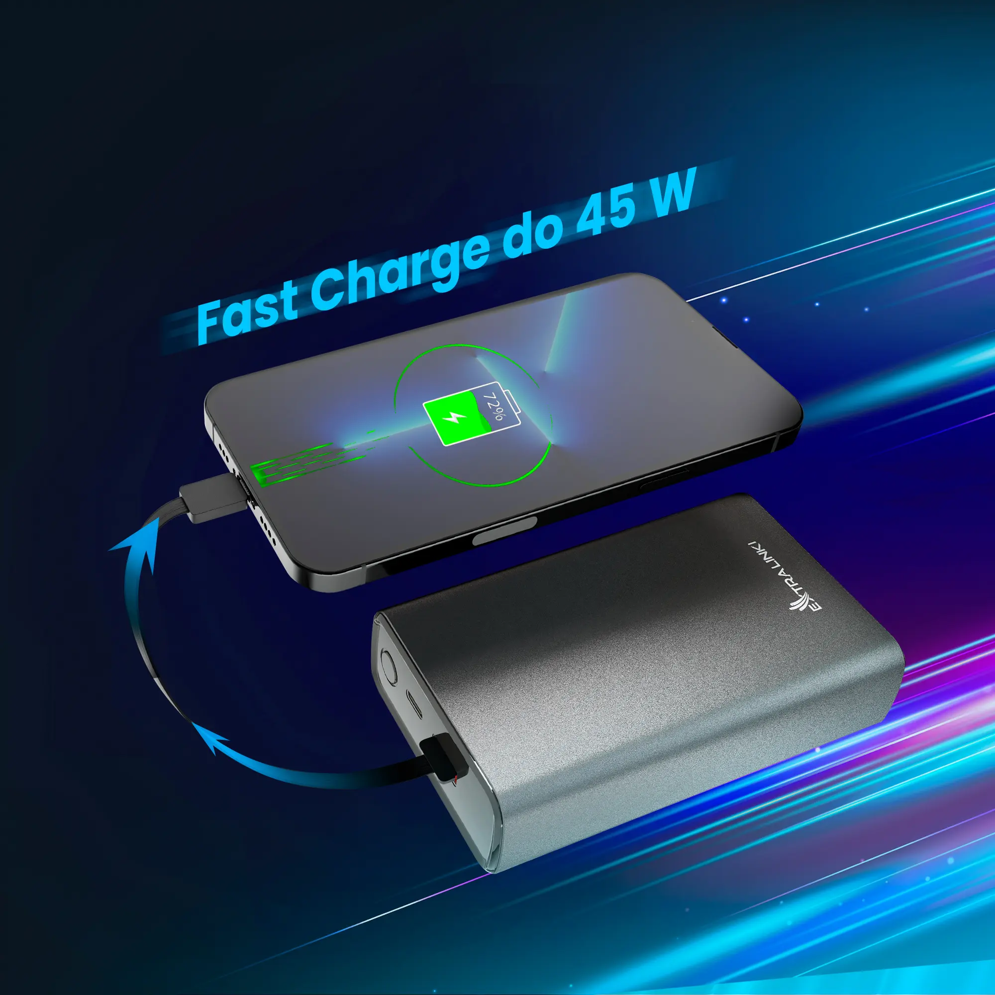 Power bank Extralink EPB-126 oferuje dużą pojemność 20000 mAh, co pozwala na wielokrotne naładowanie smartfona lub tabletu. Dzięki szybkiemu ładowaniu 45W PD cały proces jest szybki i wydajny.