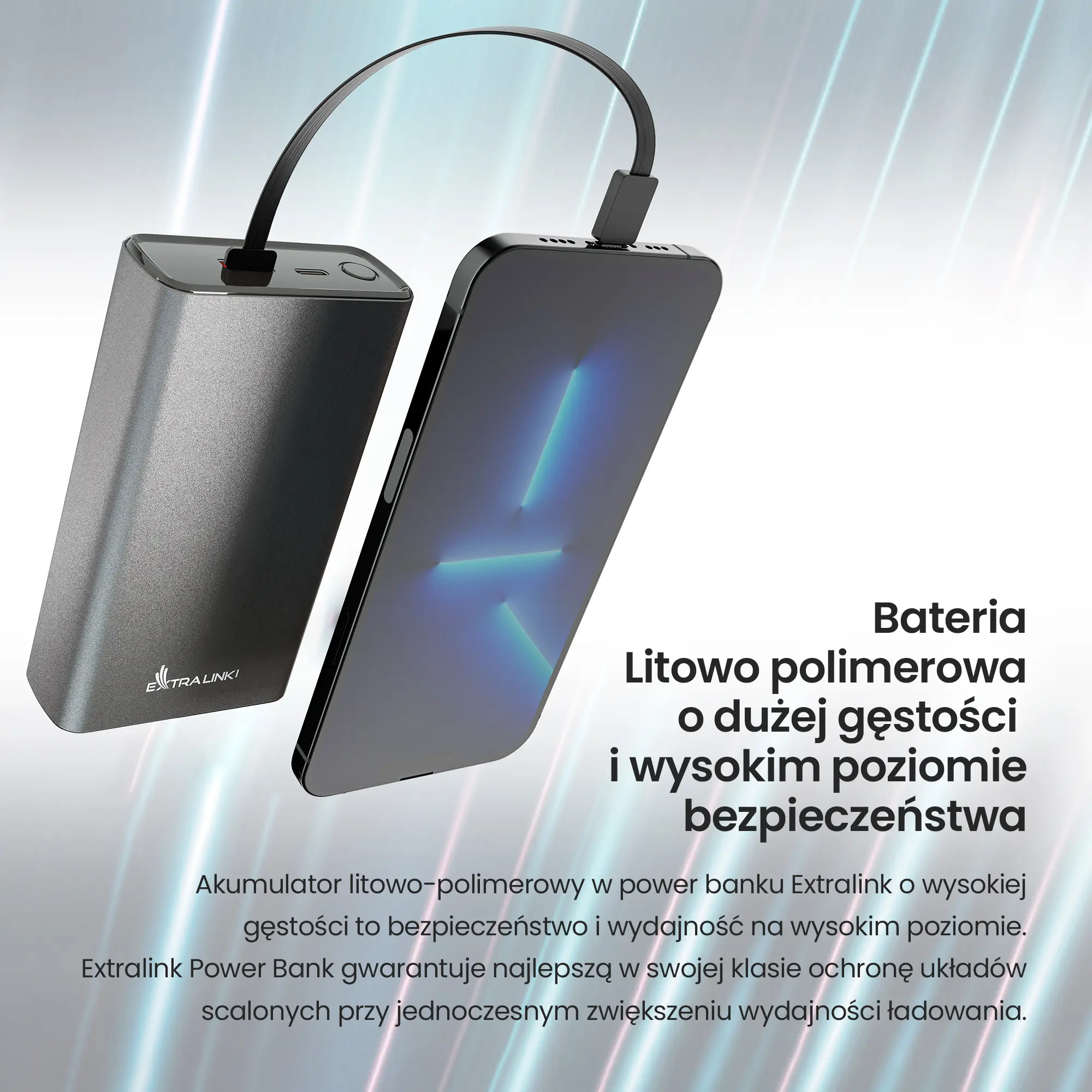 Akumulator litowo-polimerowy w power banku Extralink o wysokiej gęstości to bezpieczeństwo i wydajność na wysokim poziomie. Extralink Power Bank gwarantuje najlepszą w swojej klasie ochronę układów scalonych przy jednoczesnym zwiększeniu wydajności ładowania.