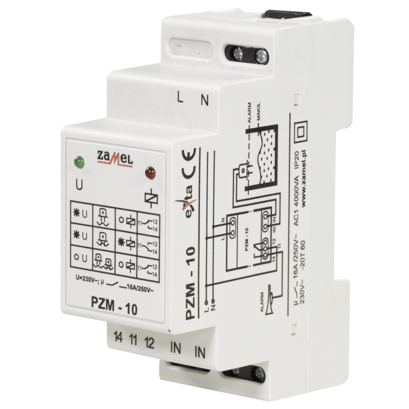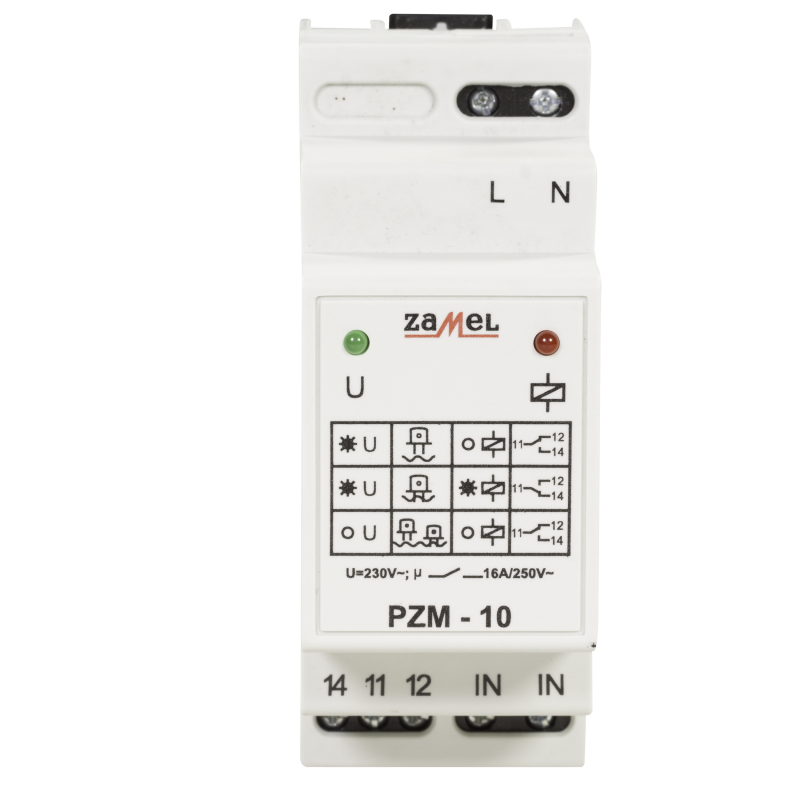 Przekaźnik zalania PZM‑10 służy do wykrywania obecności płynów przewodzących (np. woda) na wysokości zamontowanej sondy zalania (SZH‑03).