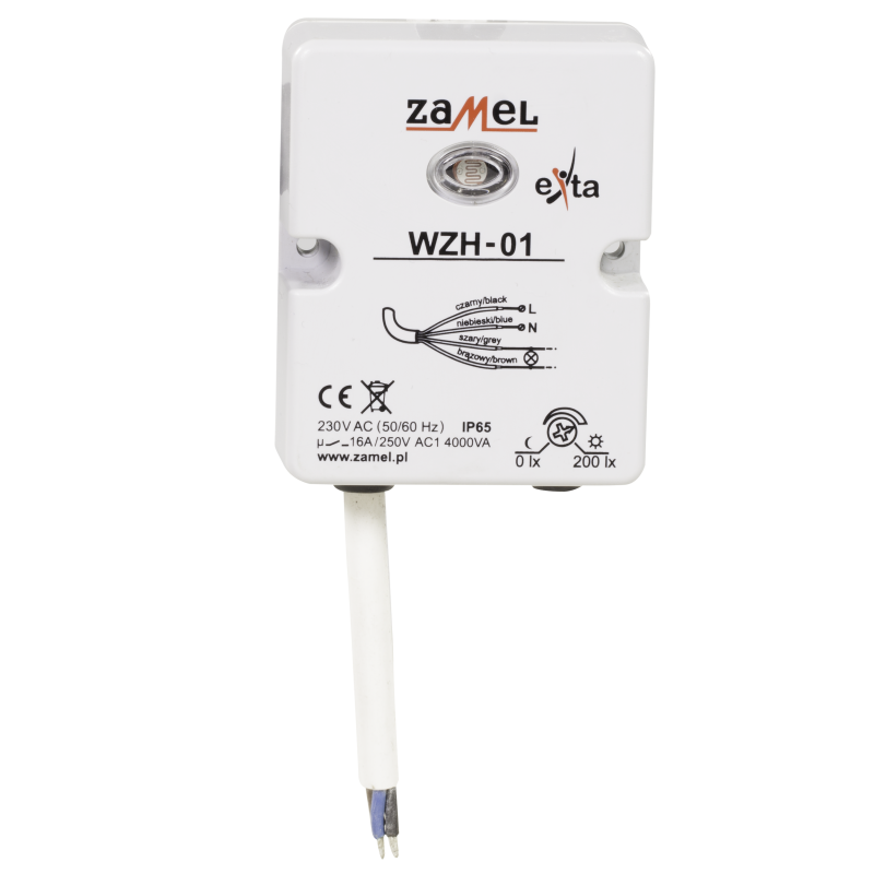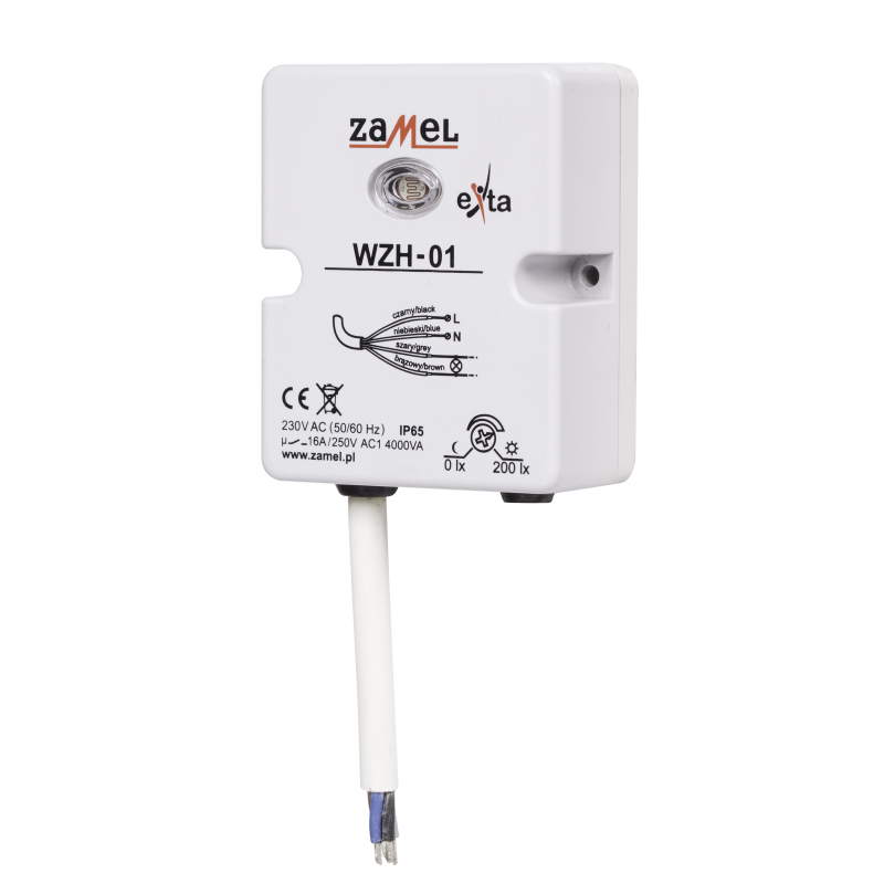 Wyłącznik zmierzchowy WZH‑01 służy do sterowania urządzeniami oświetleniowymi lub innymi odbiornikami energii w zależności od natężenia oświetlenia.