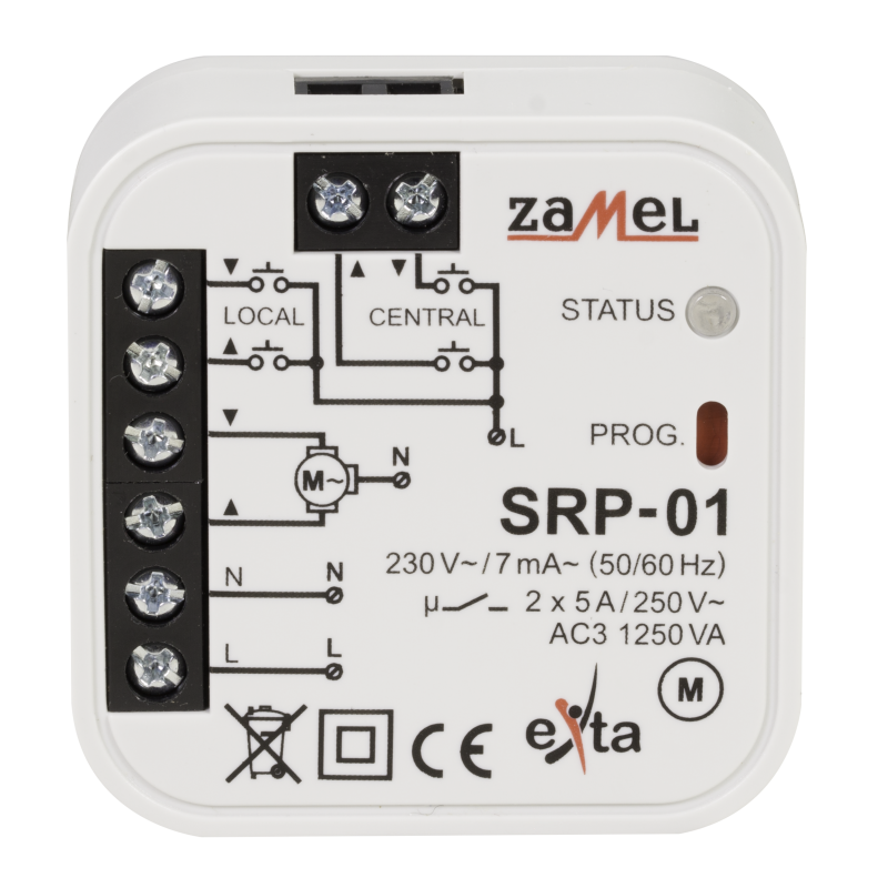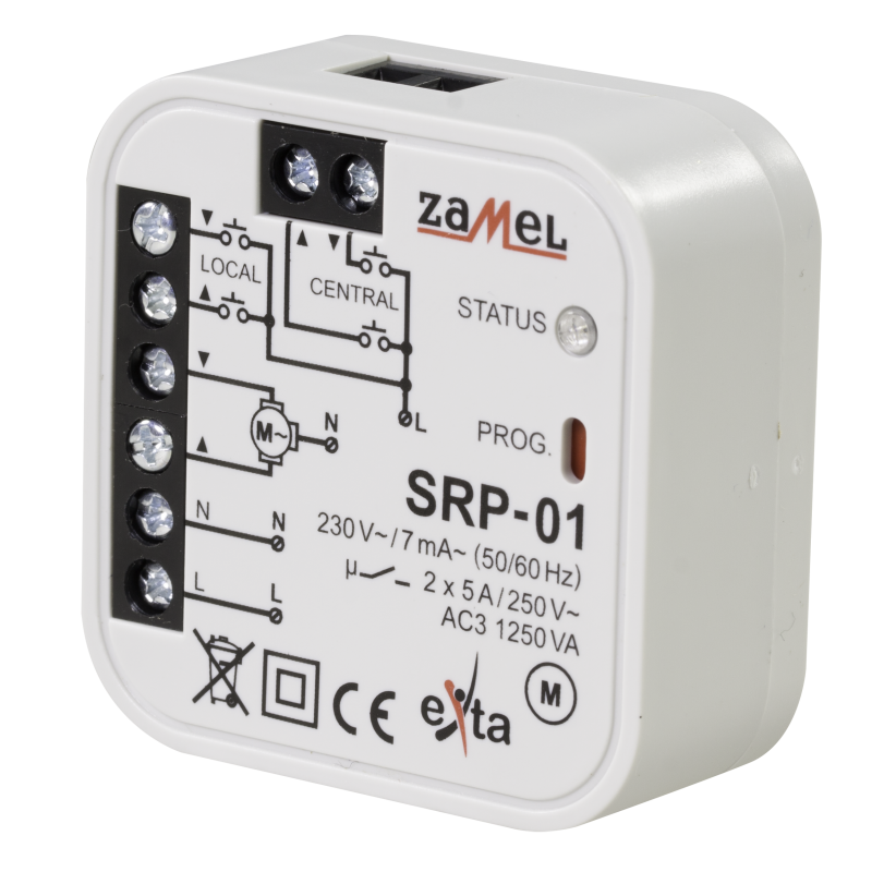 Sterownik rolet dopuszkowy SRP‑01 przeznaczony do lokalnego lub/i centralnego sterowania roletami okiennymi lub innymi urządzeniami napędzanymi silnikami jednofazowymi 230 V~.