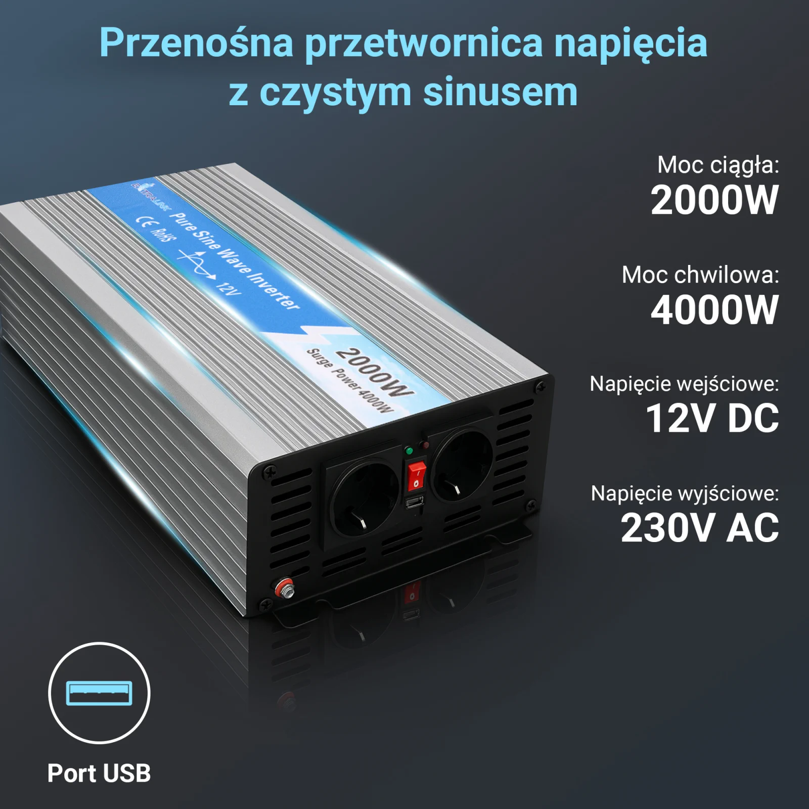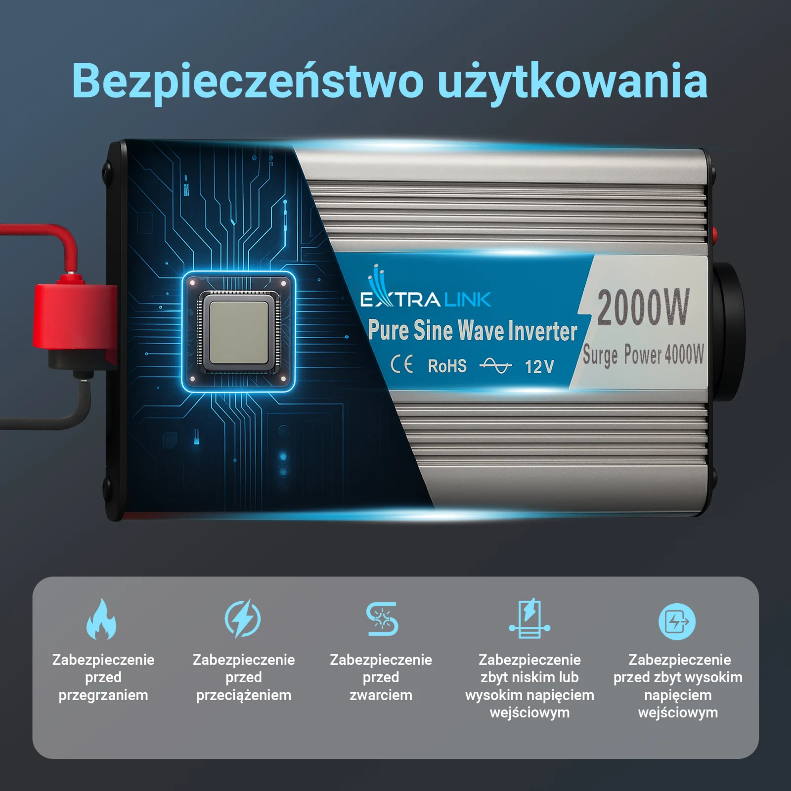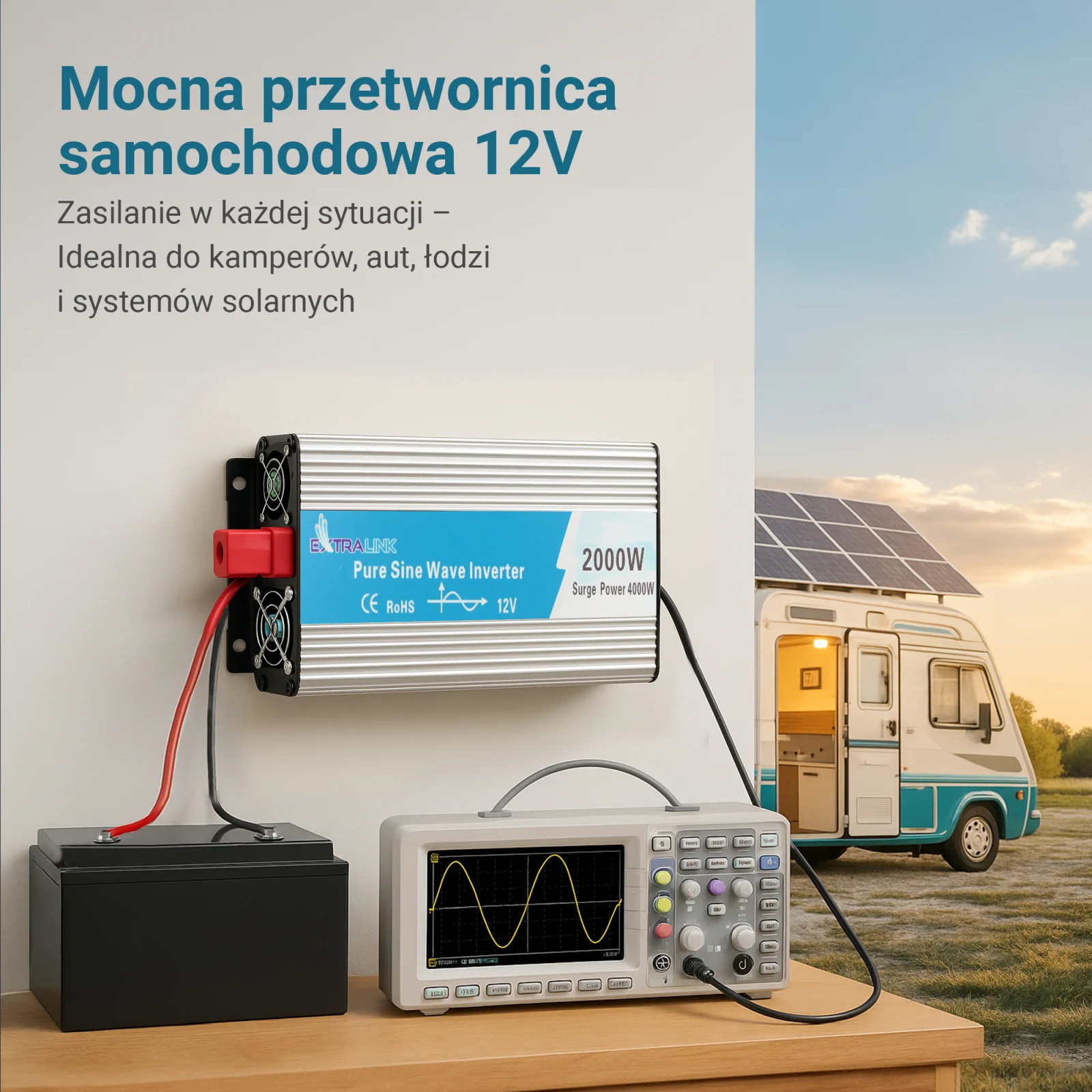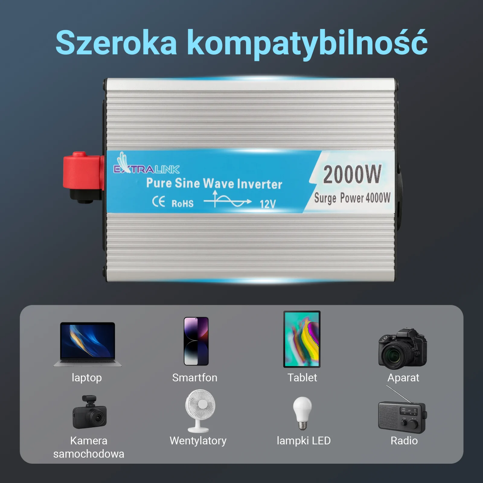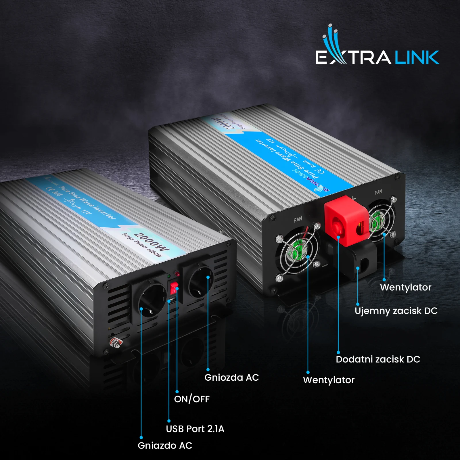 Przetwornica napięcia Extralink OPIP-2000W to urządzenie, które zamienia napięcie wyjściowe akumulatora (prąd stały, DC) na prąd sieciowy 230V AC (prąd przemienny). 230V AC to rodzaj prądu dostarczanego przez zakłady użyteczności publicznej do zasilania standardowych urządzeń AGD, takich jak telewizor, lodówka, radio, oświetlenie lub do ładowania laptopa/telefonu komórkowego itp.