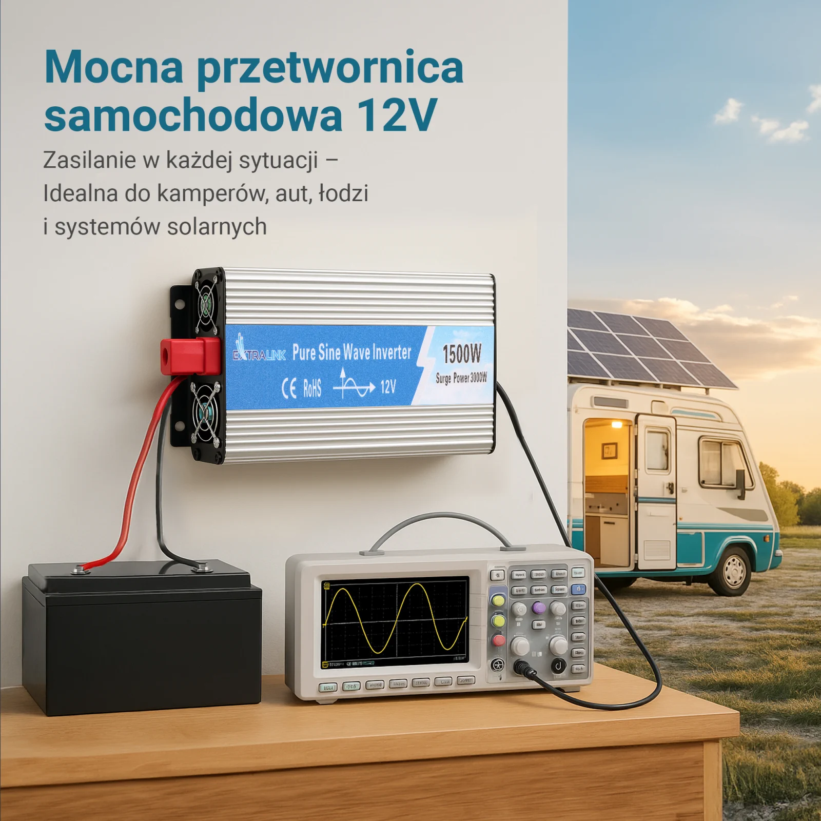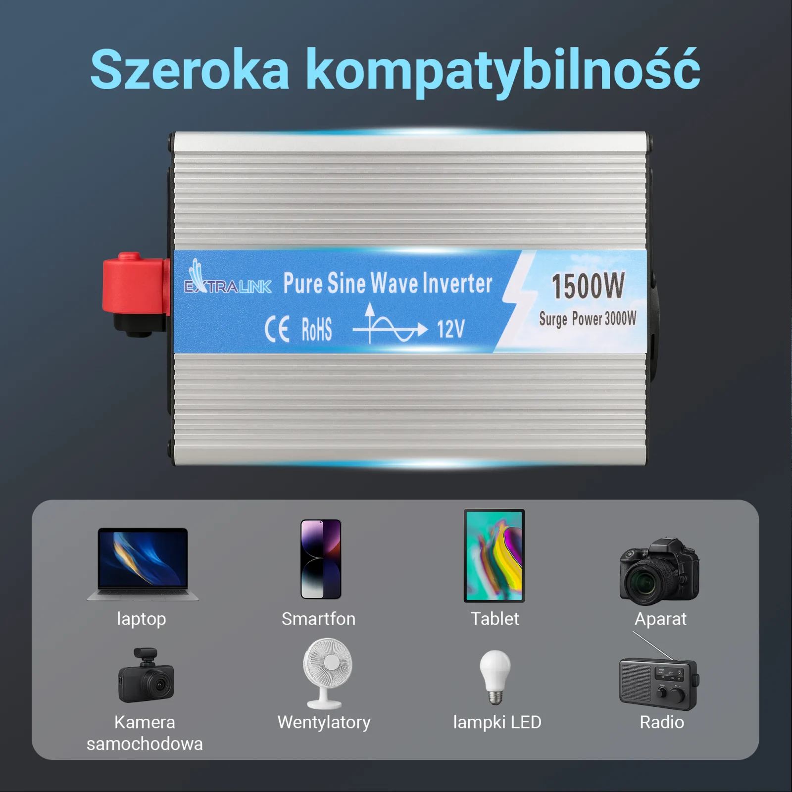 Przetwornica napięcia Extralink OPIP-1500W to urządzenie, które konwertuje prąd stały (DC) z akumulatora na prąd przemienny (AC) o napięciu 230V. Prąd o napięciu 230V AC jest stosowany do zasilania urządzeń AGD takich jak telewizory, lodówki, radia, oświetlenie oraz do ładowania laptopów i telefonów komórkowych.