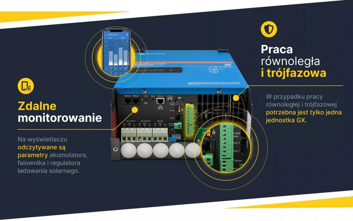 MultiPlus-II GX, Inwertor/Ładowarka z wbudowanym urządzeniem sieciowym, komunikuje się z ładowarką solarną, akumulatorami i innymi urządzeniami sterując instalacjami podłączonymi do sieci energetycznej, bez dostępu do takiej sieci, lub instalacjami zdalnymi. Działanie równoległe zapewnia zwiększoną moc użyteczną, lub prąd ładowania akumulatora, a MultiPlus-II GX można również skonfigurować do zasilania trójfazowego. Urządzenie pełne zaawansowanych funkcji, jak bezprzerwowe zasilanie, ustawianie limitów obciążenia, i uzupełnianie niedostatecznej mocy z sieci energetycznej mocą akumulatora, którymi można sterować wprost z telefonu komórkowego lub innego urządzenia inteligentnego. Możliwe jest również monitorowanie zdalne.