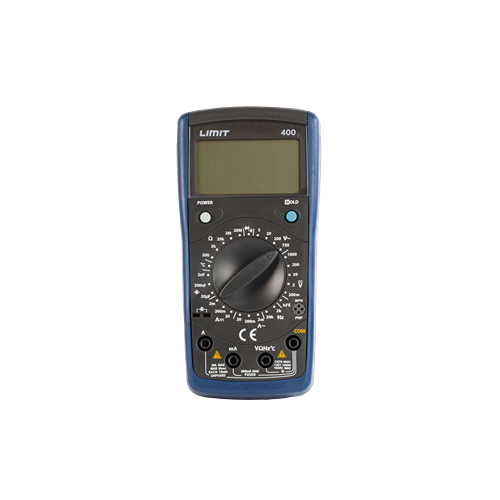 Multimetr cyfrowy Limit 400 z ręcznym wyborem zakresu. Do mierzenia napięcia stałego/przemiennego, prądu stałego/przemiennego, rezystancji, pojemności, częstotliwości i temperatury. Limit 400 Ponadto posiada następujące funkcje: test diodowy, test tranzystorów, test ciągłości obwodu z sygnalizacją akustyczną, pamięć wyniku pomiaru Hold, sygnalizacja niskiego stanu baterii. Dostarczany w komplecie z kabelkami pomiarowymi, baterią i instrukcją obsługi. Długość podziałki 1999. Izolacja CAT II 600 V / CAT I 1000V wg IEC 61010. Zabezpieczenie nadprądowe 20 A.