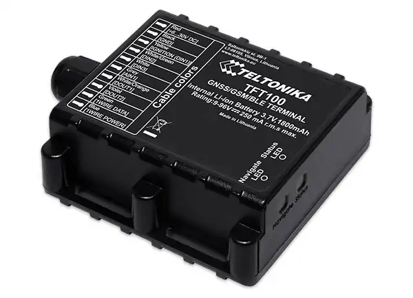 Mały, profesjonalny i wodoodporny tracker Teltonia TFT100 do wózków widłowych, motorowerów elektrycznych i skuterów elektrycznych z wewnętrzną anteną GNSS/GSM o dużym zysku, Bluetooth, zintegrowaną baterią litowo-jonową o dużej pojemności i zakresem napięcia zasilania 9-96V.