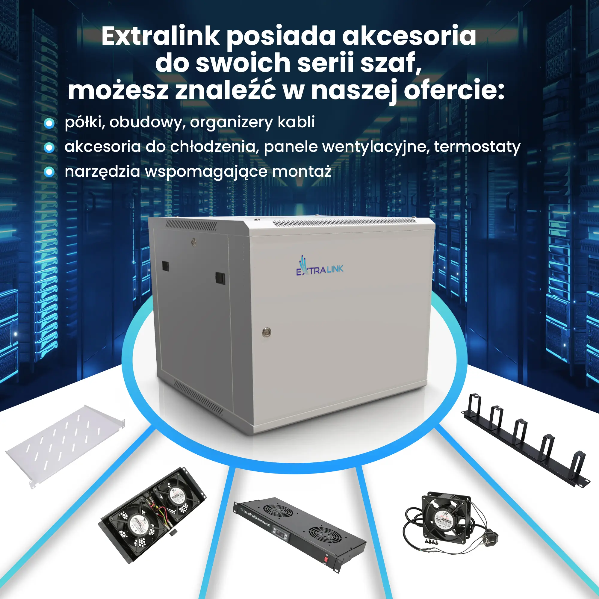 Szafa rackowa firmy Extralink jest dedykowana do instalacji na ścianie w biurach, centrach danych i pomieszczeniach kontrolujących systemy CCTV. Zewnętrzne ściany wykonane są z walcowanej na zimno blachy stalowej. Drzwi szafy zrealizowane są w całości z blachy i mogą być otwierane zarówno na lewą, jak i na prawą stronę.