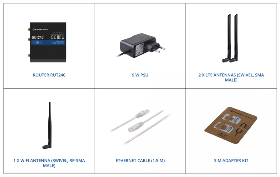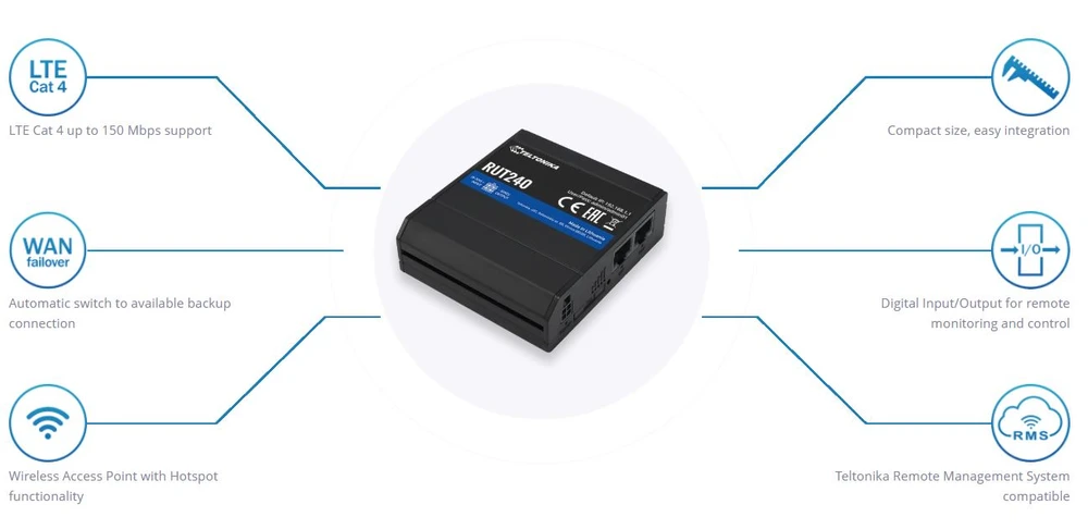 RUT240 to niewielki, ekonomiczny i wydajny przemysłowy router LTE do profesjonalnych zastosowań. Router zapewnia wysoką wydajność w komunikacji LTE. Wyposażony w slot na karty SIM oraz diody LED stanu połączenia. Zewnętrzne złącza anten umożliwiają zastosowanie anten o większym zysku, aby zwiększyć moc sygnału LTE oraz łatwe znalezienie najlepszej lokalizacji sygnału.