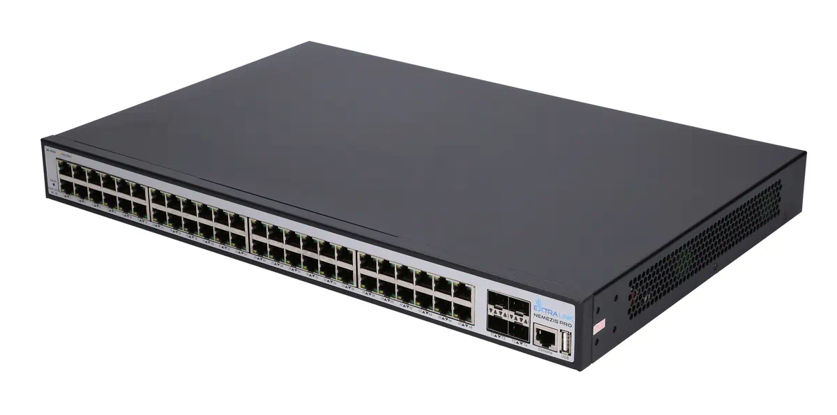 48-portowy przełącznik Gigabit Smart PoE+ z 48 portami 1000BASE-T PoE+ i czterema gniazdami 10G SFP+ zapewnia zaawansowane funkcje zarządzania z przepustowością przełączania 256 Gb/s. Extralink Nemezis Pro jest wyposażony w porty 1000BASE-T PoE+, które zapewniają wyższe gigabitowe prędkości do 1000 Mbps z istniejącym okablowaniem Cat5e lub lepszym. Ten przełącznik zapewnia 48 połączeń PoE+ z maksymalnym budżetem mocy 500 W i dostarcza do 30 W mocy na port dla urządzeń takich jak punkty dostępowe, kamery PTZ IP i systemy telefonii VoIP.
