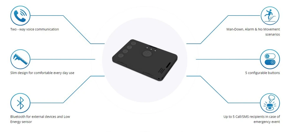 Teltonika GH5200 jest AUTONOMICZNYM, osobistym urządzeniem śledzącym z łącznością GNSS, GSM i Bluetooth, które zaprojektowano z myślą o bezpieczeństwie osób pracujących w odosobnieniu bez ścisłego i bezpośredniego nadzoru, np. dla wykonujących działalność na własny rachunek czy pracujących poza standardowymi godzinami pracy, a także dla osób korzystających z opieki zdrowotnej. Lokalizator jest wyposażony w programowalne przyciski, baterię 1050 mAh, oferuje także możliwość wysokiej jakości komunikacji głosowej, dzięki temu zapewnia skuteczną ochronę.