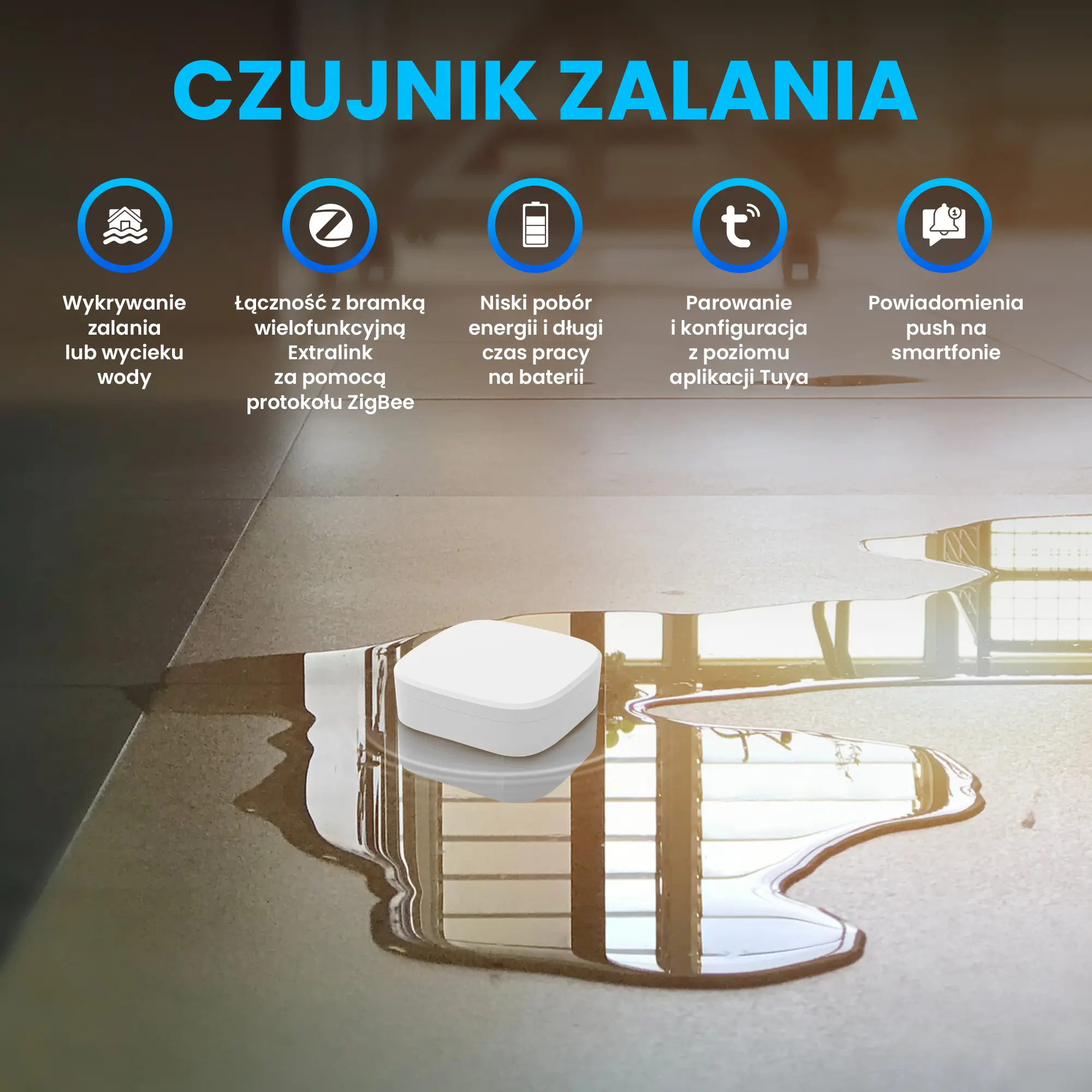 Extralink Water Sensor to inteligentny czujnik wody, który wykrywa zalanie lub wyciek wody w oparciu o stan przewodzenia między metalowymi sondami. Czujnik łączy się z bramką wielofunkcyjną Extralink Smart Gateway za pomocą protokołu ZigBee i pozwala na tworzenie scen inteligentnego domu. Czujnik można z łatwością sparować z bramką Extralink z poziomu aplikacji Tuya. Czujnik ma niski pobór energii i długi czas pracy na baterii.