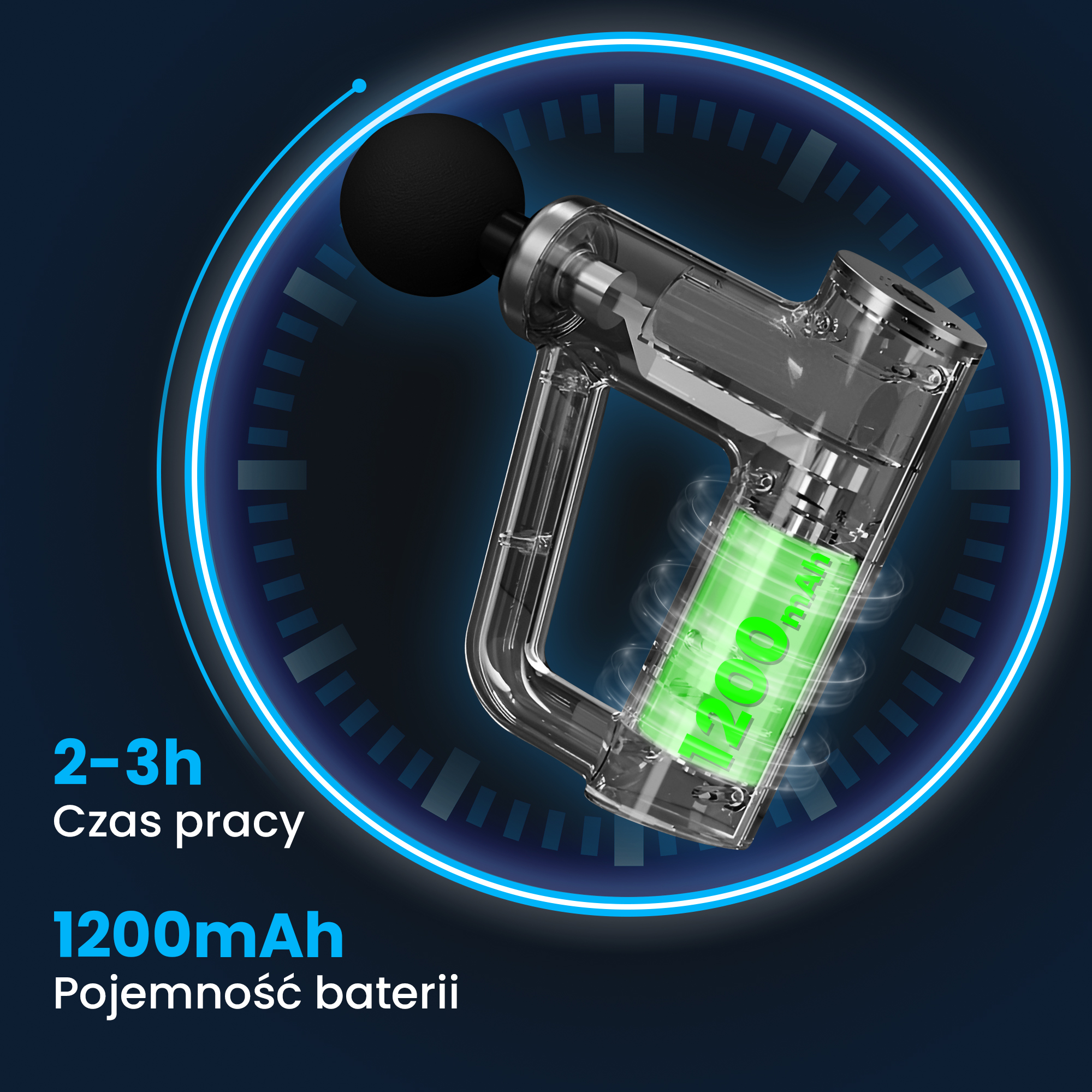 Z wbudowaną baterią litową o pojemności 1200mAh i kompaktowymi wymiarami, pistolet do masażu Extralink zapewnia maksymalną mobilność i wygodę użytkowania. Maksymalny czas pracy wynosi aż do 3 godzin na jednym ładowaniu! Korzystaj z pistoletu do masażu już po 3 godzinach ładowania przy użyciu dołączonego kabla USB-C.
