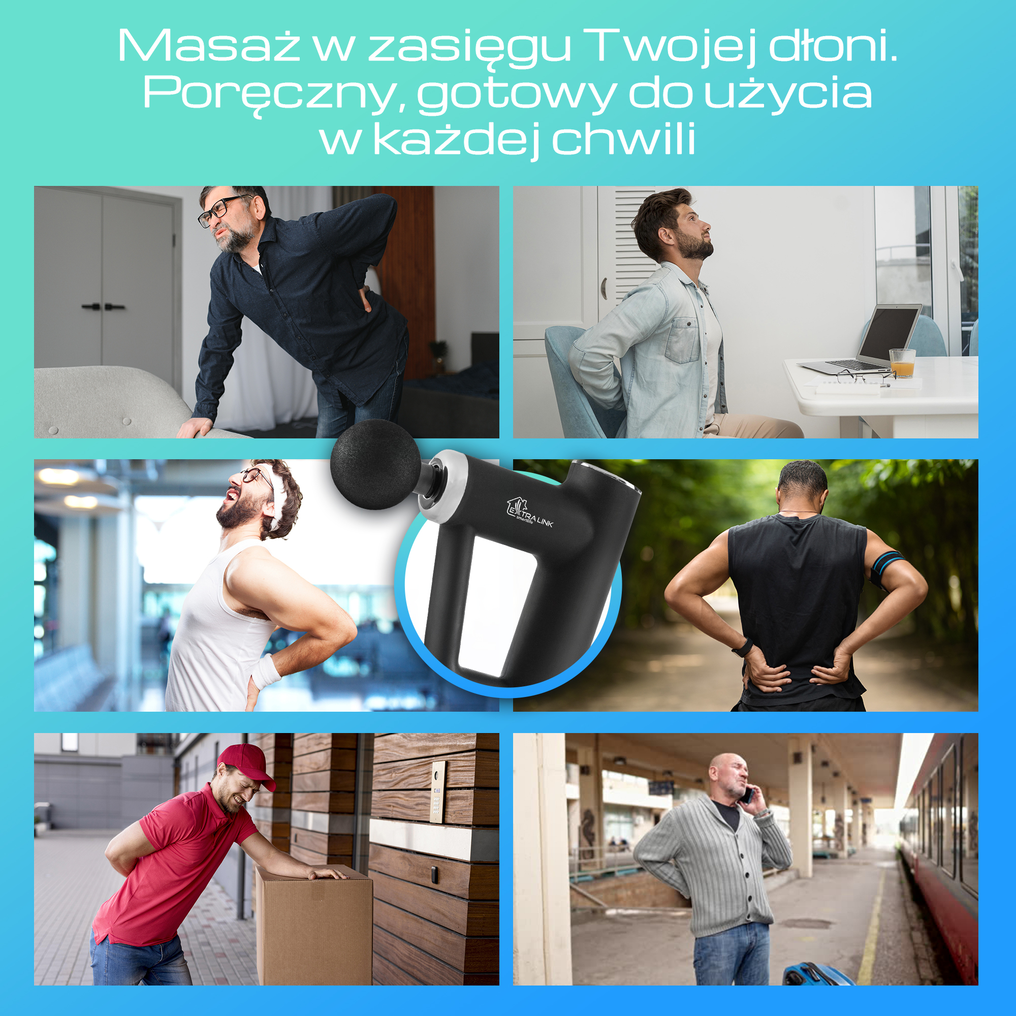 Wielofunkcyjny bezprzewodowy pistolet masujący Extralink pomoże w pobudzeniu mięśni, przyspieszeniu regeneracji, złagodzeniu bólu mięśniowego oraz redukcji nagromadzonego kwasu mlekowego. Poprawia krążenie krwi oraz zwiększa ruchomość stawów. Skutecznie przywraca równowagę między więzadłami a mięśniami. Nadaje się zarówno dla profesjonalnych sportowców, amatorów sportu, pracowników biurowych narażonych na duże obciążenie jak i dla każdego.